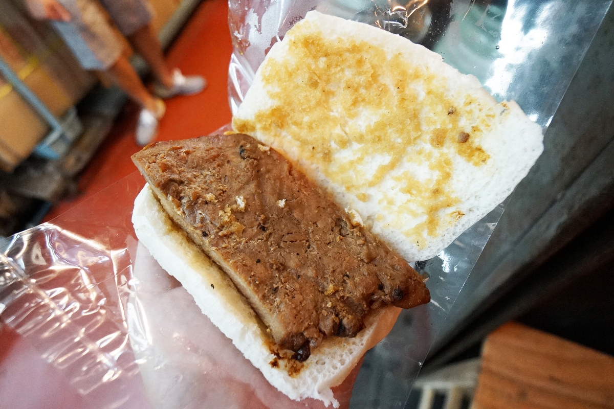 熱門商品其一就是賣60泰銖的「蜂蜜豬肉漢堡」 , 不過我覺得叫「漢堡」有點怪怪… 它其實是一個扁扁的饅頭切開再包豬排進去, 看起來跟刈包有點像, 當天我們買了以後因為阿峯嫌熱, 所以最後外帶回飯店房間才吃, 但他們說雖然放了兩、三個小時, 依舊覺得很美味。