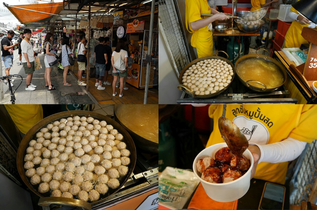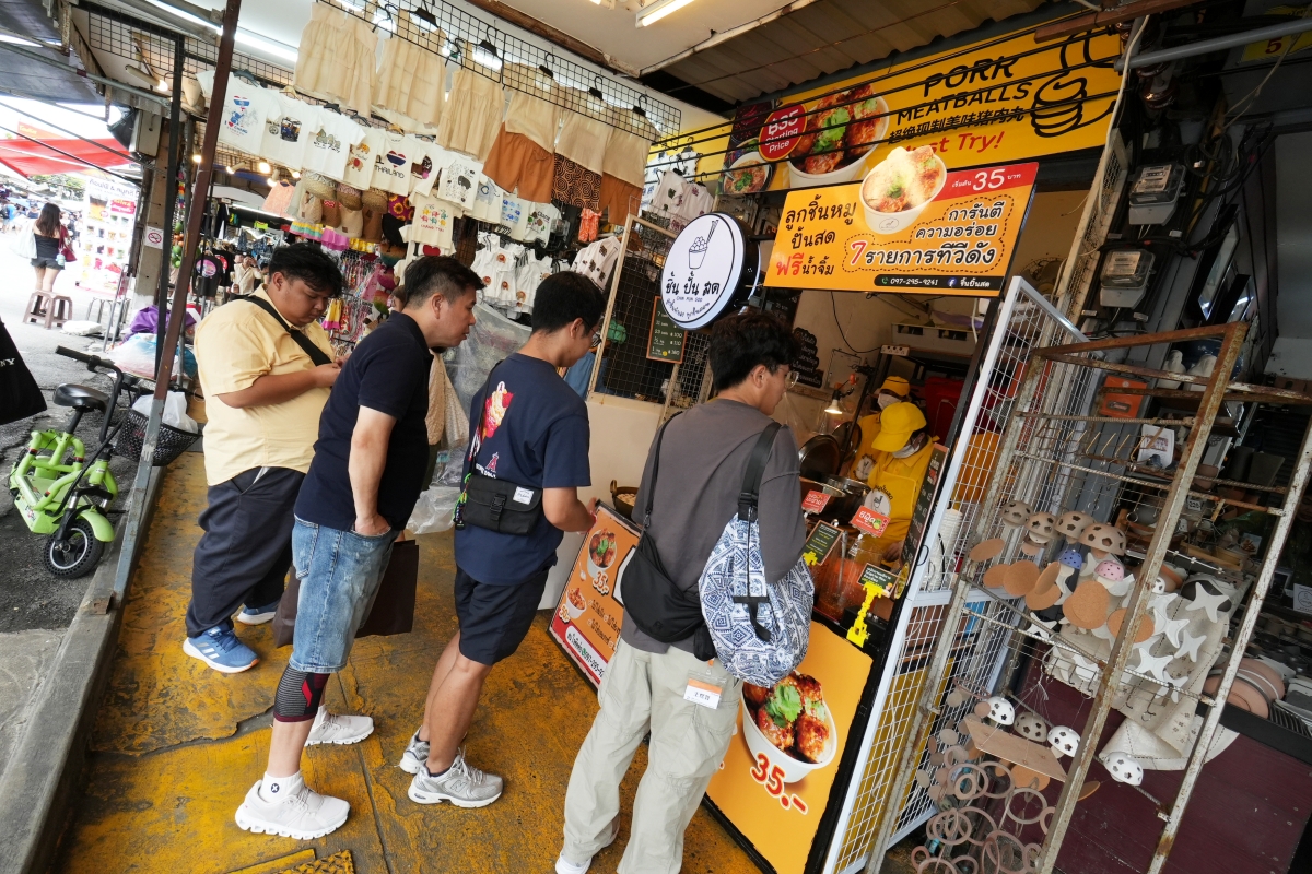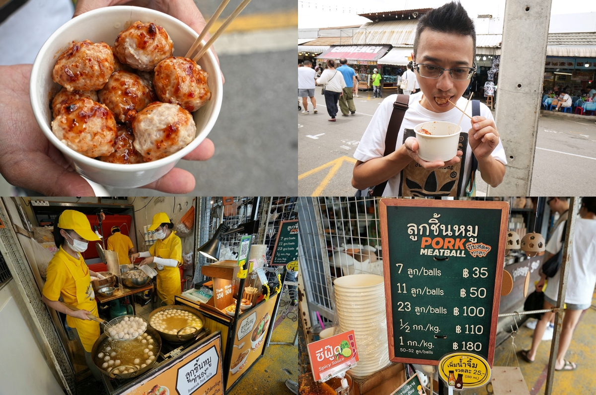 我要分享的第一攤是照片中的「ชิ้นปั้นสด สาขา สวนจตุจักร pork meatballs」,Google Map上的店名就是寫這樣,然後你們點我設的超連結就可以直接看到它在地圖上的確切位置(後面其他11家美食也比照辦理),從照片中就不難看出它真的是人氣很旺的美食攤位,但大家不用擔心會排隊排很久,通常大概排個3~5分鐘就可以吃到了。
