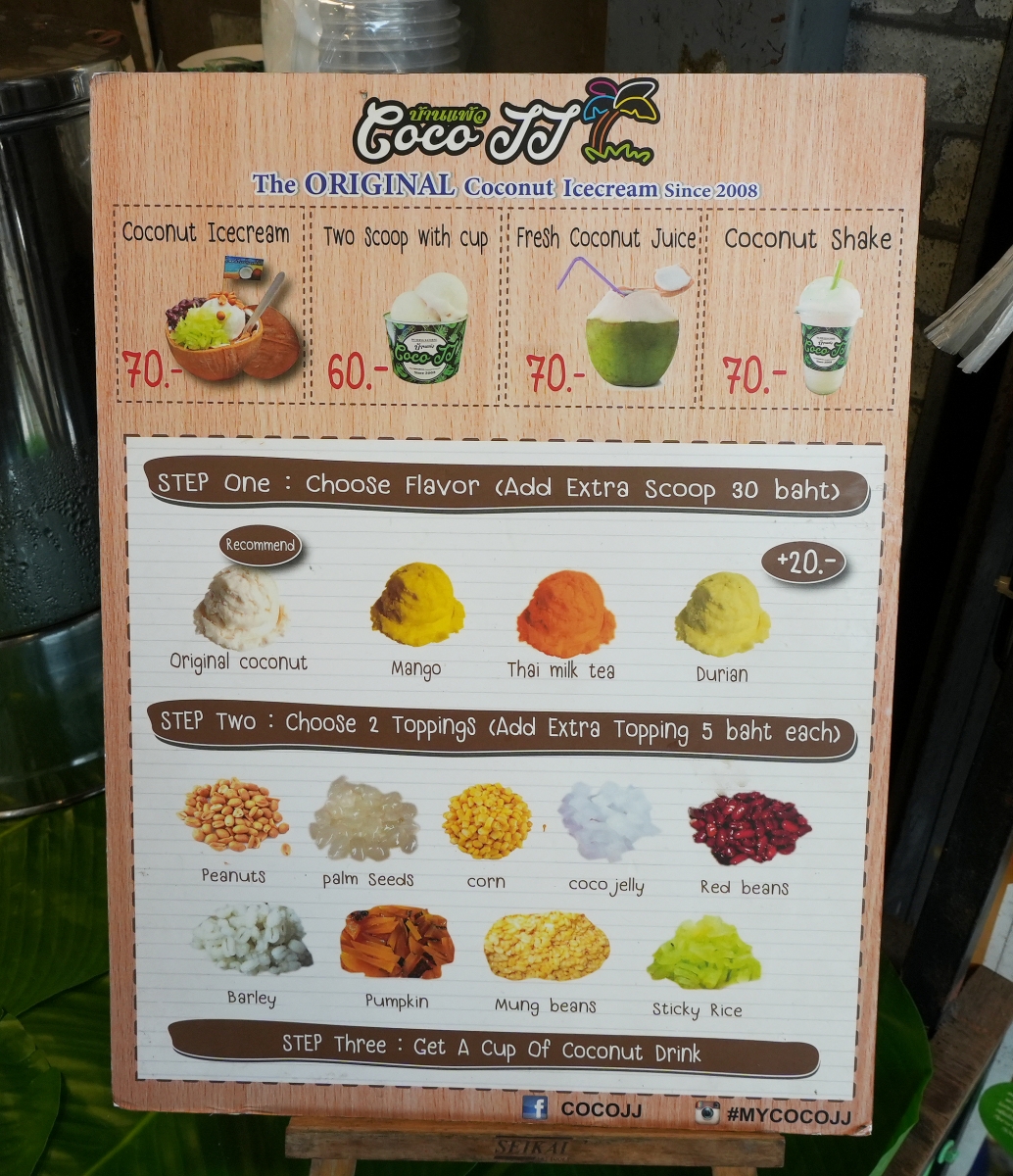 詳細菜單給你們參考,招牌的椰子冰淇淋上面可以自選喜歡口味的一球冰淇淋,除了椰子口味的以外還有芒果、榴槤、泰奶口味看起來也都感覺不賴。