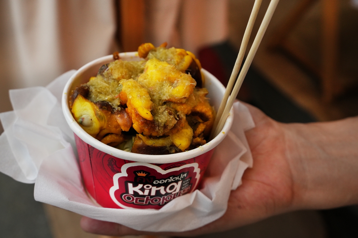 但我自己是覺得這樣的量、即使底下鋪著高麗菜絲賣100泰銖也還算合理啦~上面淋上的青辣椒醬鮮辣中又帶著蒜香,蠻開胃的,小章魚的口感也很彈牙。(但如果你們吃到底下高麗菜絲會覺得是有被詐騙的感覺的話…可以Pass這一家)