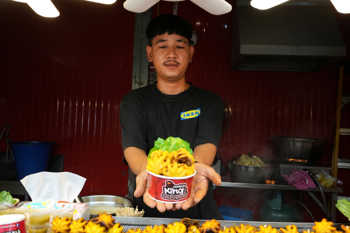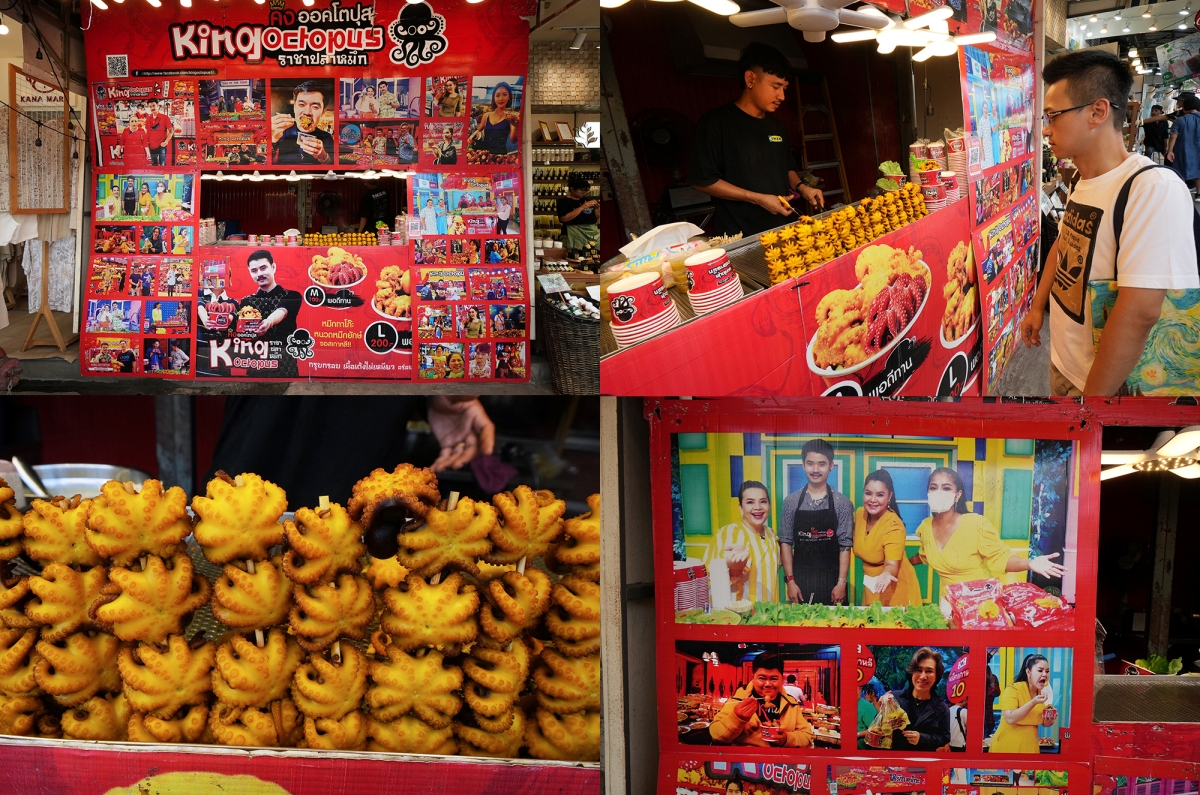 「ปราณี ก๋วยเตี๋ยวเป็ด Duck Noodle」的斜對面是也沒有Google Map標點的「ราชาปลาหมึก King Octopus」,老闆是一位上過很多美食節目的小哥,然後好像很多國內外的名人都曾經吃過他賣的小章魚。(右下角照片那位是台灣「阿鴻上菜」的主持人「陳鴻」嗎?他左邊那位很像一位日本知名藝人)