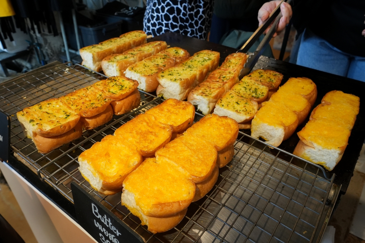 這裡販售的主要是「煎大蒜麵包」和「煎奶油麵包」,都是在鐵板上香煎而成,一份只要30泰銖而已。