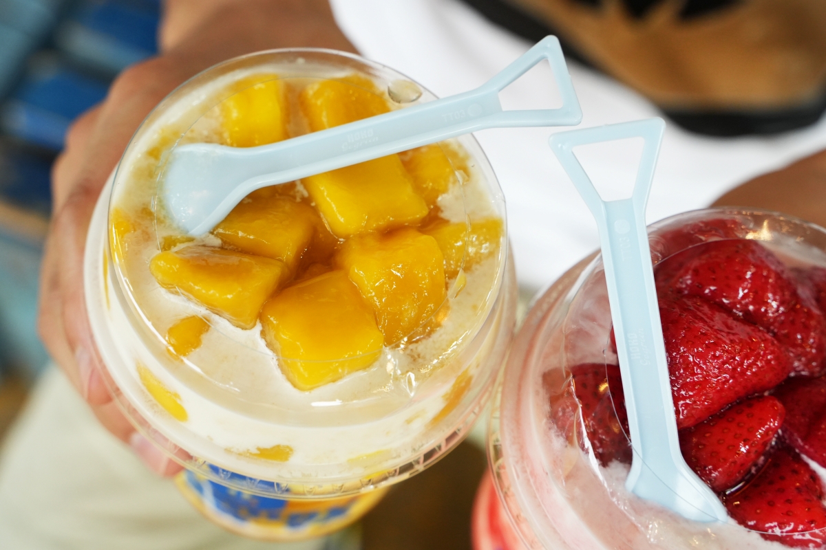 我們那天點了招牌的「芒果牛奶冰」和「草莓牛奶冰」,都是89泰銖,拍起來都感覺蠻吸睛的,湯匙也設計成小鏟子的模樣,相當有趣~♪