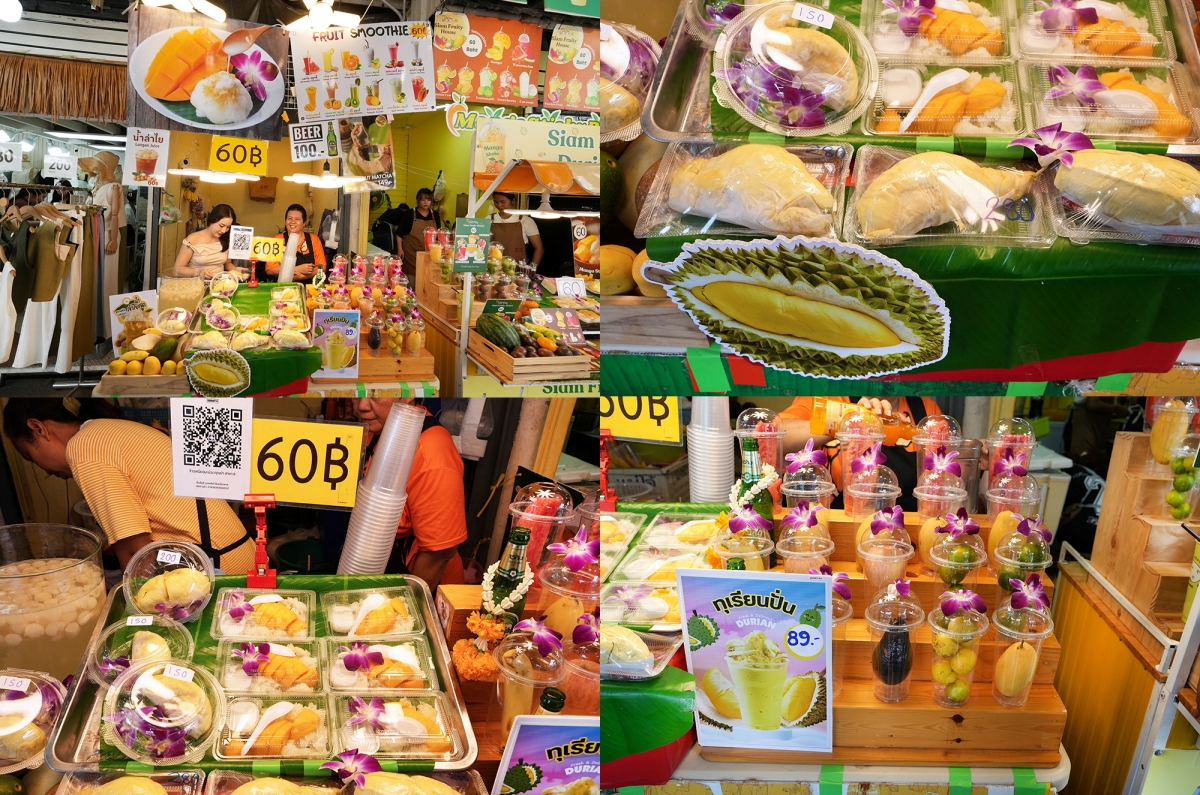 從上一家「ชิ้นปั้นสด สาขา สวนจตุจักร pork meatballs」往旁邊走幾步可以看到照片中這個賣水果冰沙、芒果糯米飯、榴槤為主的攤位(目前沒有Google標點),老闆娘看起來是一個跟路邊攤有點格格不入的大美女,我那時想說芒果糯米飯60泰銖也不算貴,可以買來吃吃看,如果好吃的話就順便推薦給大家。