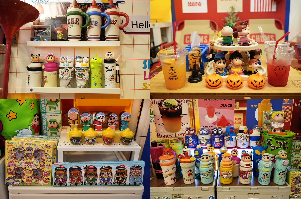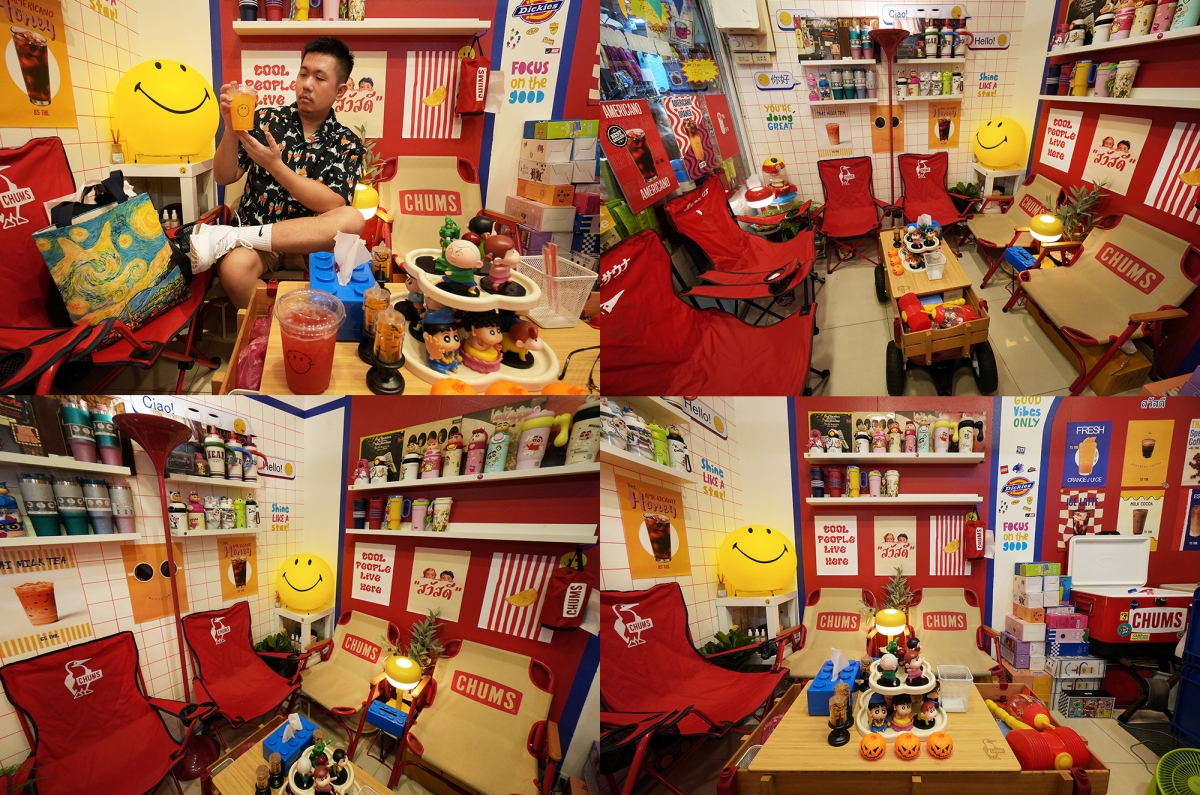 我們那天是沒點什麼太特別的飲料(就點招牌的特調柳橙汁跟西瓜汁而已)…但很享受這露營風結合大量蠟筆小新周邊商品、充滿童趣感的環境,這裡的店員也比一般咖啡廳的更熱情,好幾位都一直圍著我們攀談…後來還問說可不可以幫我們拍照然後po在他們的IG上面(後來也真的有po),然後我們坐在那裡休息的時候有其他阿斗仔來兜售自製的鬆餅,他們也問我們要不要吃…