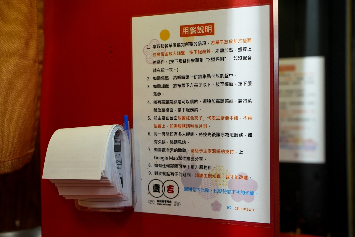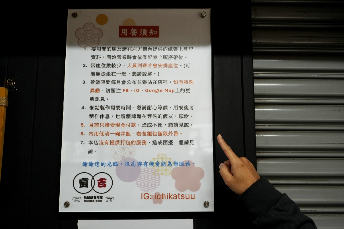 在這邊用餐有一些相關的規定,例如「要用餐要先在櫃台登記資料」、「人數到齊才安排就座」、「只接受現金付款」、「內用低消一人一碗丼飯」、「不提供打包服務」…等,我是覺得都蠻合理的啦~即使你們到日本去旅遊,也有些餐廳的規定跟他們的一模一樣。