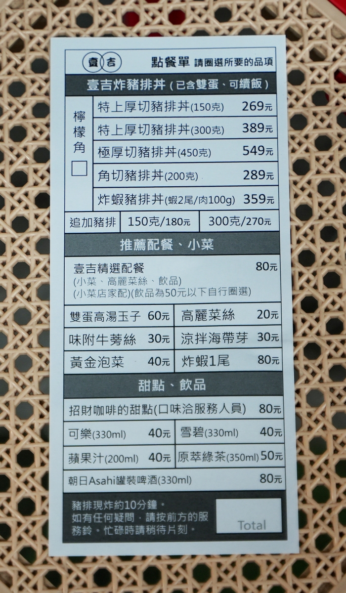 再來看到的是「壹吉精選配餐」,簡單來說就是會有店家搭配的小菜、高麗菜絲,然後還可以任選一種50元以內的飲料。