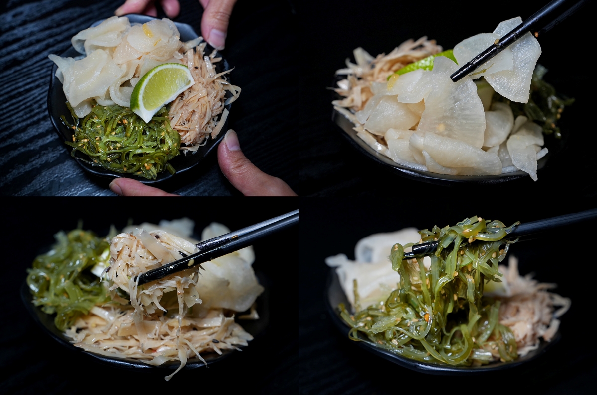 我們那天吃到的小菜是涼拌海帶芽、味附牛蒡絲跟醃漬過的白蘿蔔,三種都蠻爽口的,吃豬排丼的時候一面配著這些小菜一起品嚐可以大大增加續戰力!