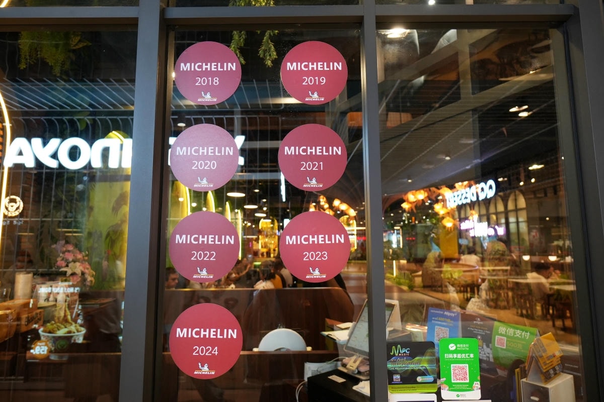 門口的玻璃上可以看到Kiew Kai Ka 2018年到2024年獲得的米其林必比登推薦貼紙。