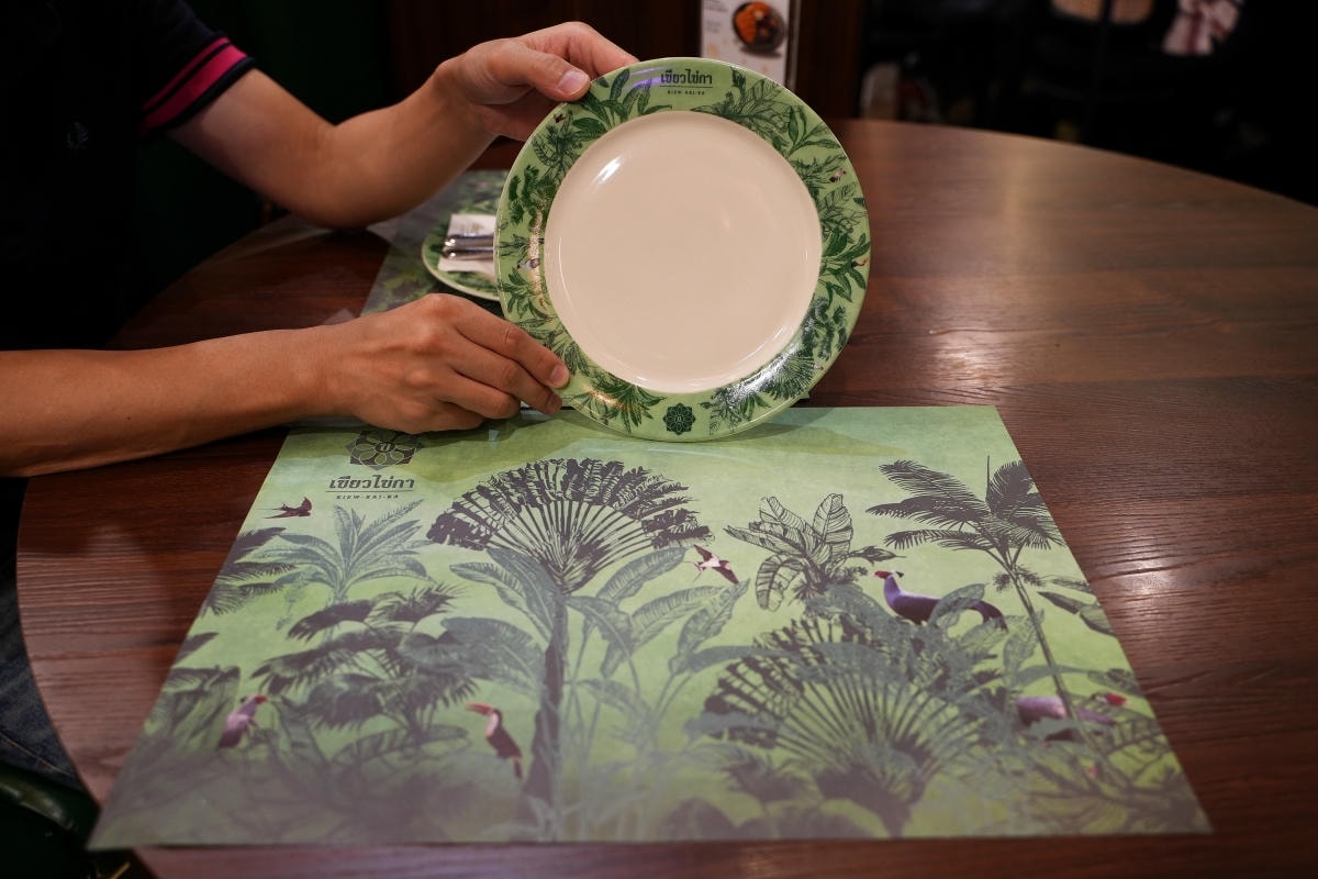 店名的「Kiew Kai Ka」,我上網查了一下…有人說是「綠色、蛋、烏鴉」的意思,也有人說是「綠色、蛋、咖啡」的意思,但另外有一個說法是這就是一種特殊顏色的敘述(有點類似我們會用「鴨屎黃」來形容某種黃色),通常這種顏色只會用於形容一種泰國傳統的「宋加洛陶」,然後這顏色也可以稱為「青釉綠」之類的。