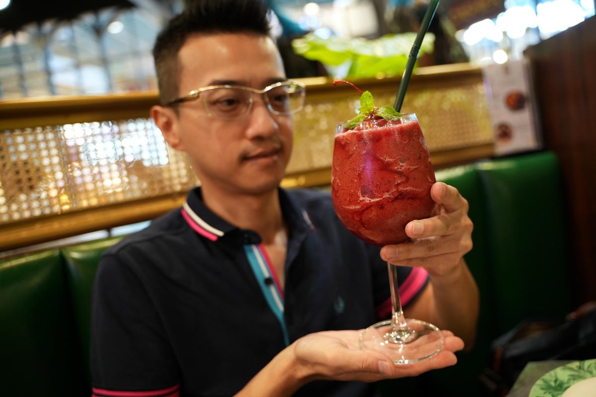 首先這一杯是「綜合莓果冰沙」,喝起來感覺融合了藍莓、草莓、覆盆子等莓果的滋味,酸甜開胃又很消暑,用高腳杯裝也感覺格外有儀式感。