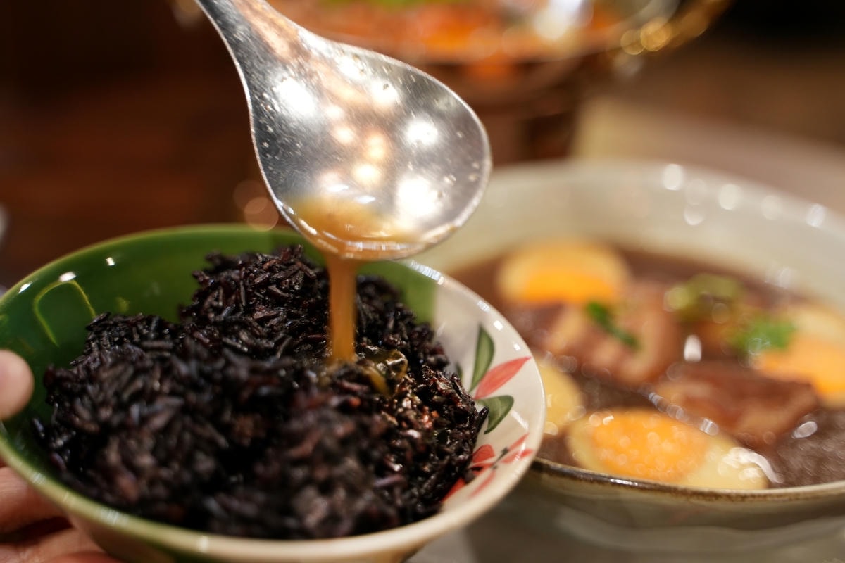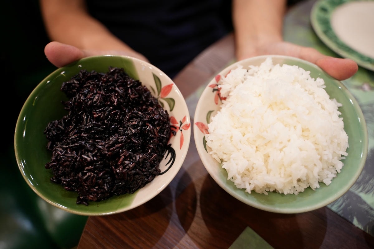 左邊那碗長得很像我們的紫米飯,但它的英文是「Riceberry Rice」,我上網查了一下得到的結果是~它是泰國的特殊水稻品種,由「Jao Hom Nin」和「Khao Dawk Mali 105」雜交而成,不但營養豐富而且也不會太硬、蠻容易咀嚼的,另外一碗吃起來就是好吃的茉莉香米飯的感覺。