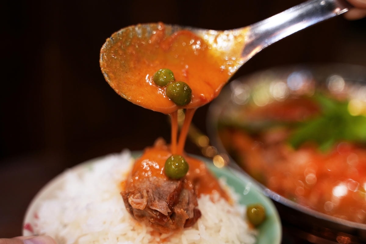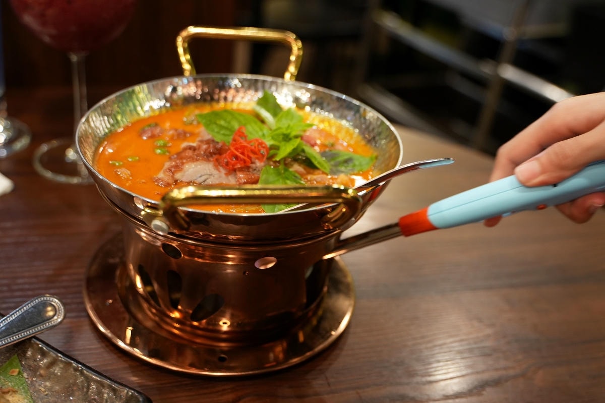 這一份就是這篇食記最大重點的「紅咖哩烤鴨和水果」,那個「紅」主要來自於紅辣椒與乾辣椒,有另外添加香茅、南薑、檸檬葉、香菜根、大蒜、紅蔥頭、蝦醬等多種香料和椰奶一起去熬煮,通常辣度會比綠咖哩低一點(綠咖哩的青辣椒比紅辣椒更辣),但每間餐廳咖哩調製的比例不太一樣,所以未必100%都是遵照此原則。