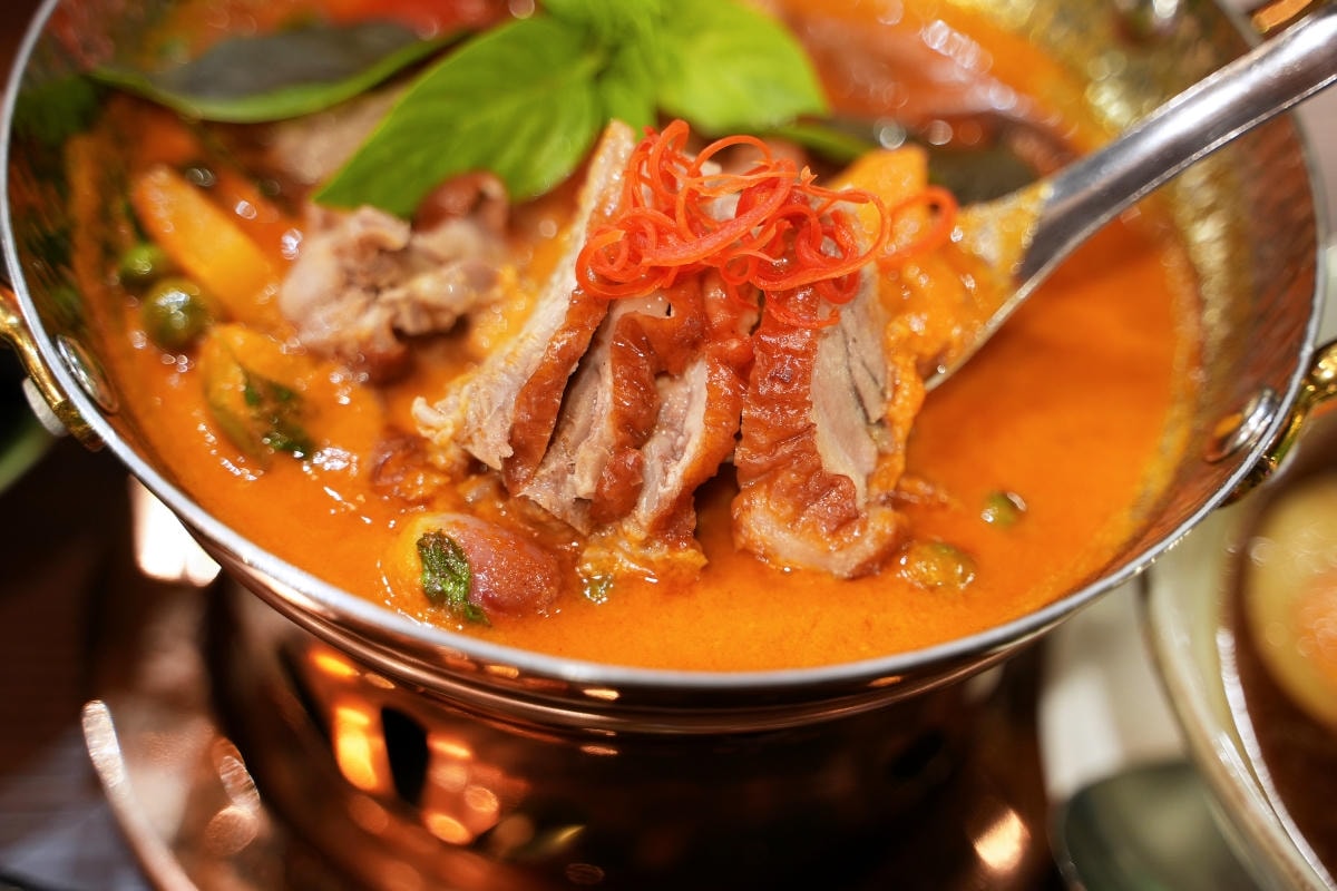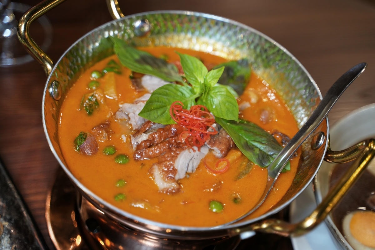 剛入口時辛香中又帶點甜味(它咖哩有加鳳梨、荔枝、小番茄等水果進去,可以直接吃到果肉),整個醬汁融入了椰奶、紅辣椒、香茅、南薑的南洋風味,非常有層次,可是過兩、三秒以後就會有辣味猛然竄出,然後它的烤鴨皮香肉嫩,因為一直泡在咖哩醬汁內,所以鴨皮口感不會像台灣吃到的片皮鴨那麼酥脆。
