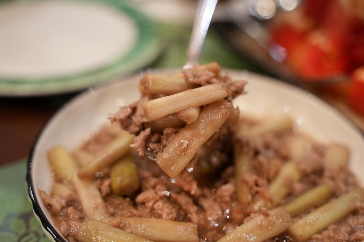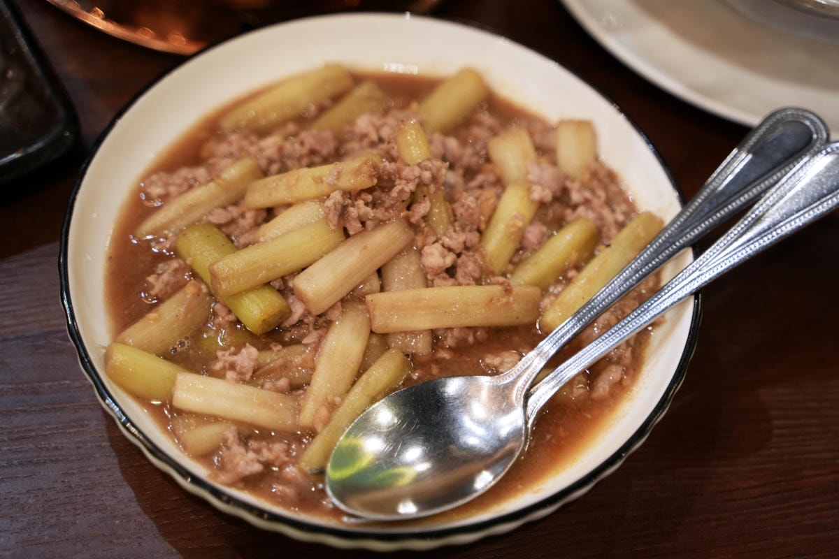不過後來的反轉是~阿峯愛上了這道料理,他說這道是他這一餐覺得最好吃的一道菜,那蓮花莖口感爽脆又沒奇怪的菜味,有類似在吃炒水蓮的爽度(但口感也跟水蓮有差異),裡頭雖然感覺加了不少魚露、聞起來味道有點重,但吃進嘴裡卻意外美味又不死鹹,他在飯上淋上剛剛的滷汁再配上這道的肉末與醬汁就可以嗑到停不下來!