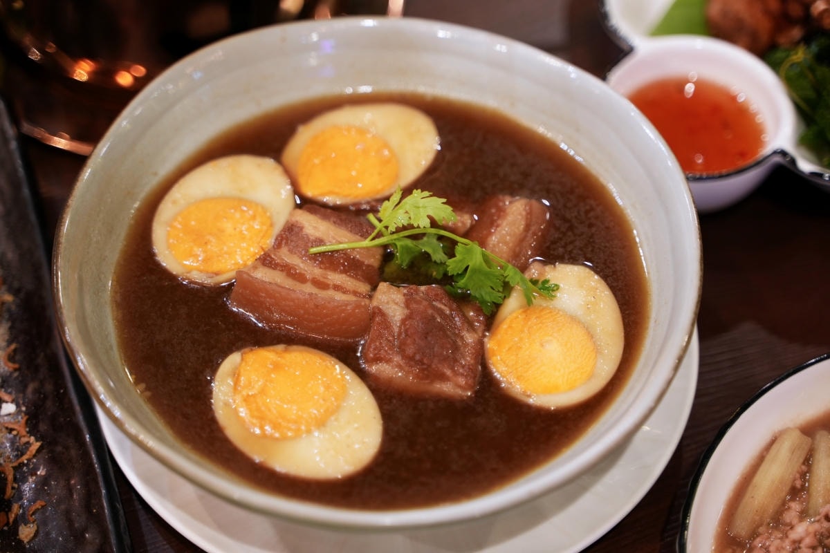 下一道在菜單上叫「泰式滷肉滷蛋」,老實講我本來沒有要點這一道的,但是阿峯說他想吃。(這一道不屬於以酸味、辣味為主的那種泰國菜,比較算是早期潮汕地區移民來泰國的華人帶來的料理,但久而久之也演變成泰國的小吃,就像他們的海南雞飯、豬腳飯一樣)
