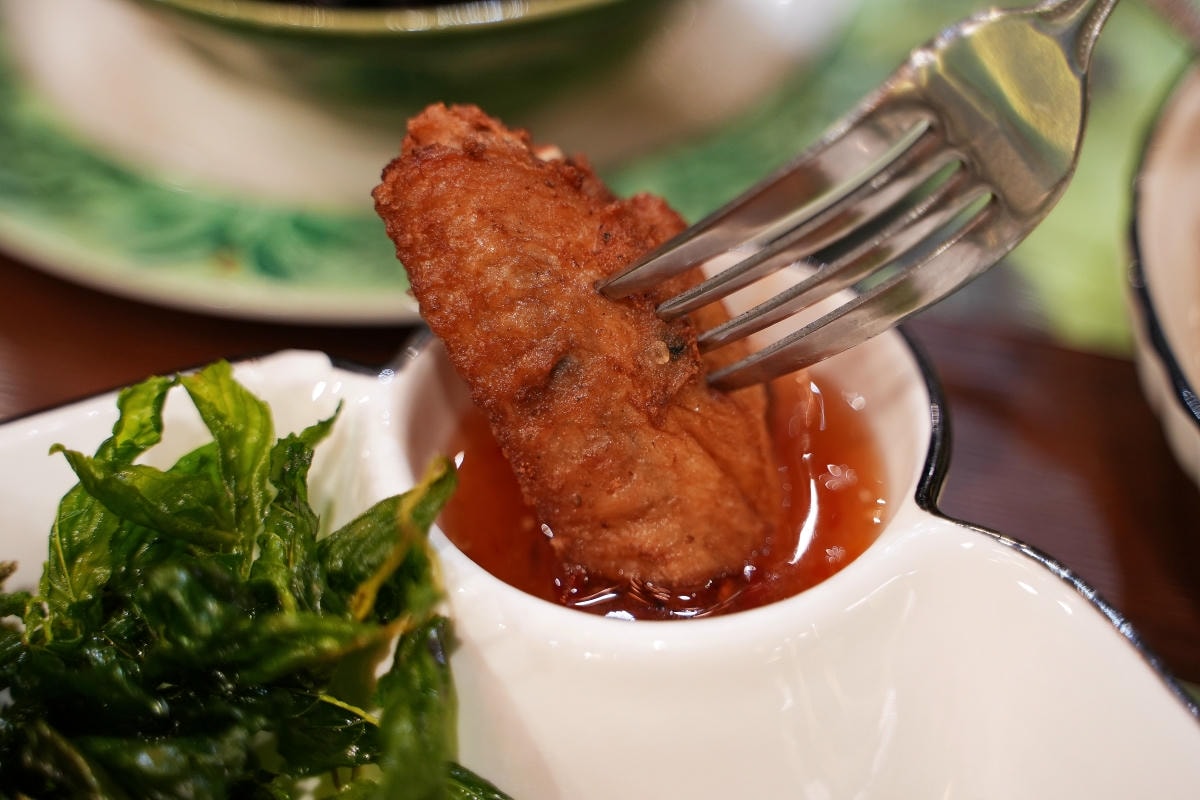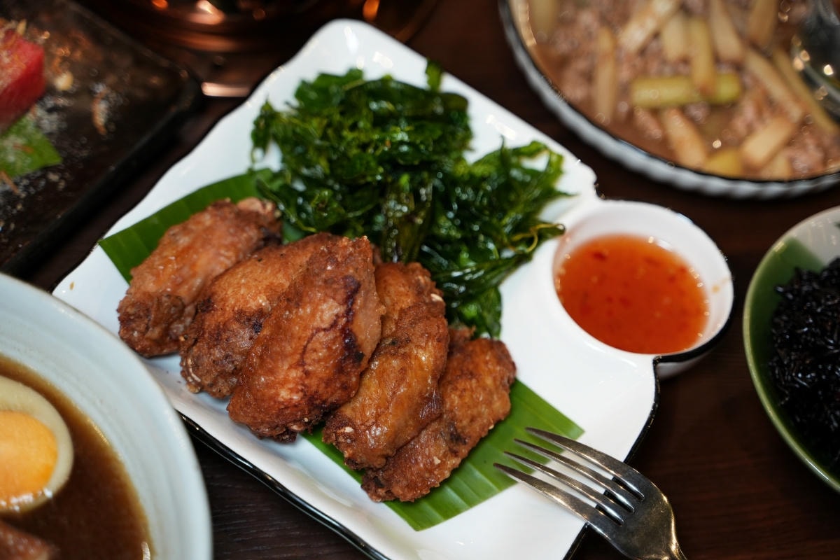 泰國的炸雞翅有一種路數是炸得乾到不行,追求那種乾乾、嚼起來很香的滋味,但我們這次點的炸雞翅算是沒有炸到很乾的那種,外皮有先去醃漬入味,咬下去會滲出肉汁來,可以搭配甜甜的沾醬還有炸過的打拋葉(還是羅勒葉?)一起品嚐。