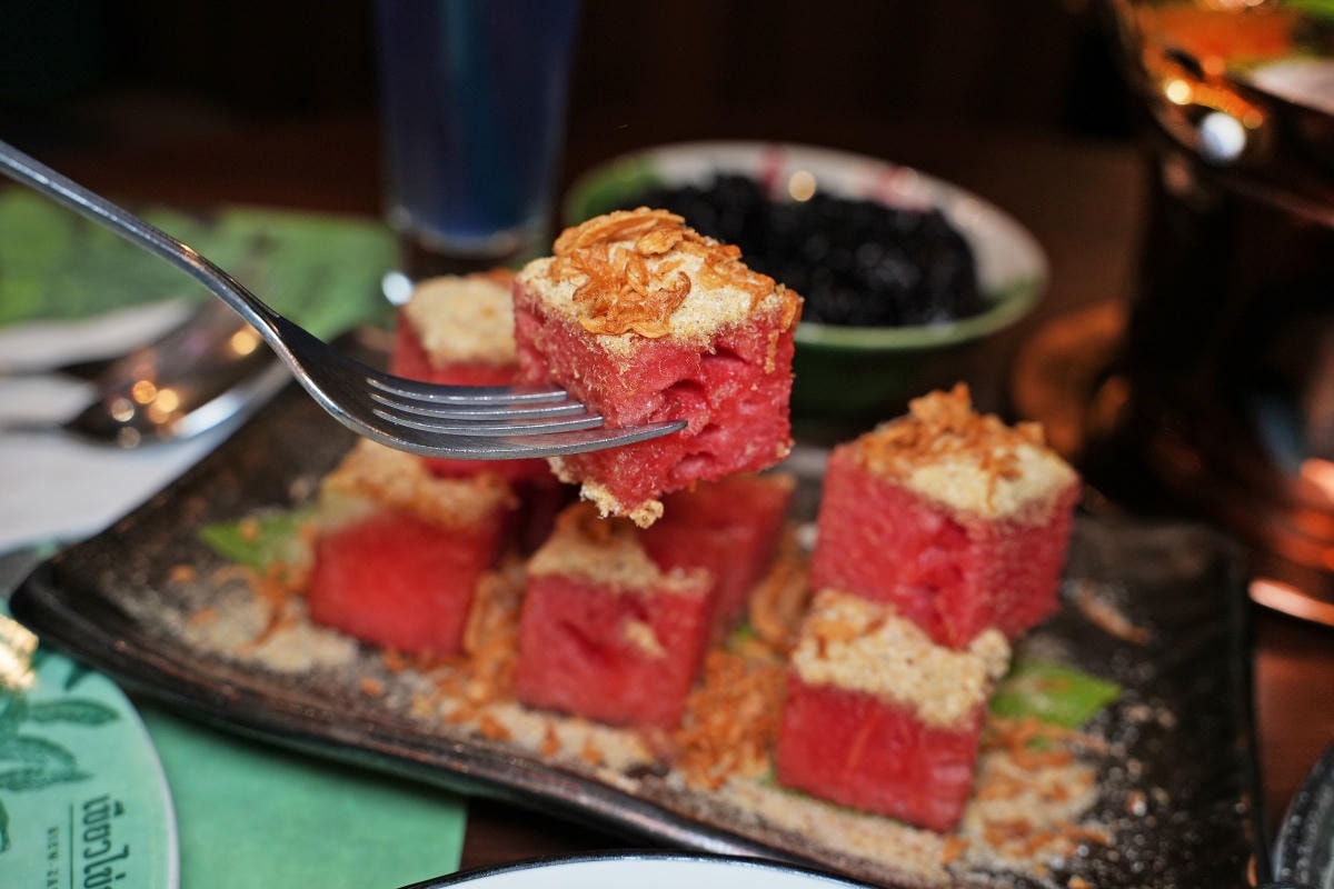 這一道的味道其實不難想像,你們如果把家裡的西瓜配魚鬆吃也是類似的味道(它的中文翻譯寫魚乾,但其實就是我們的魚鬆,很多泰國餐廳的中文翻譯都會有些地方對台灣人來說有點怪怪的感覺,大家習慣就好),但泰國的魚鬆跟台灣常吃到的還是略有口感跟風味的差異就是了,他們的好像是有加一些糖,然後質地也比較細一點,配著多汁的新鮮西瓜一起吃就是很爽口。