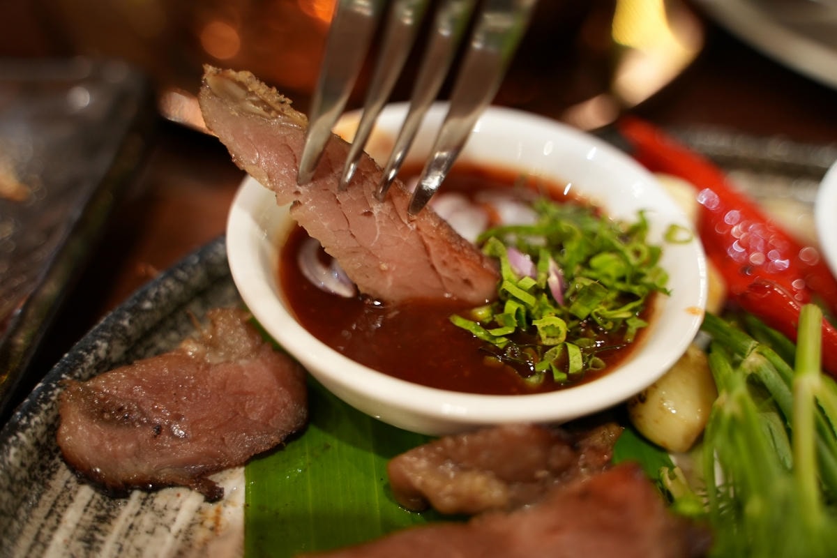 本來其實這烤牛肉吃起來會是鮮嫩多汁的口感,結果完全沒有,普通到不行,以前在很多平價泰式餐廳吃到的烤牛肉都比這裡的好吃…(但醬汁有加分,一種沾醬甜中帶辣,另外一種是又酸又辣,都很惹味)