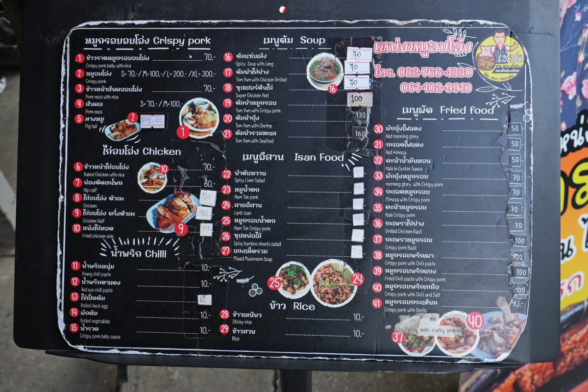 這裡的「脆皮豬肉」有很多不同的尺寸可以選,100g的70泰銖、150g的100泰銖、280g的200泰銖、420g的300泰銖,我們那天是選150g的。(因為還想點很多其他的菜)
