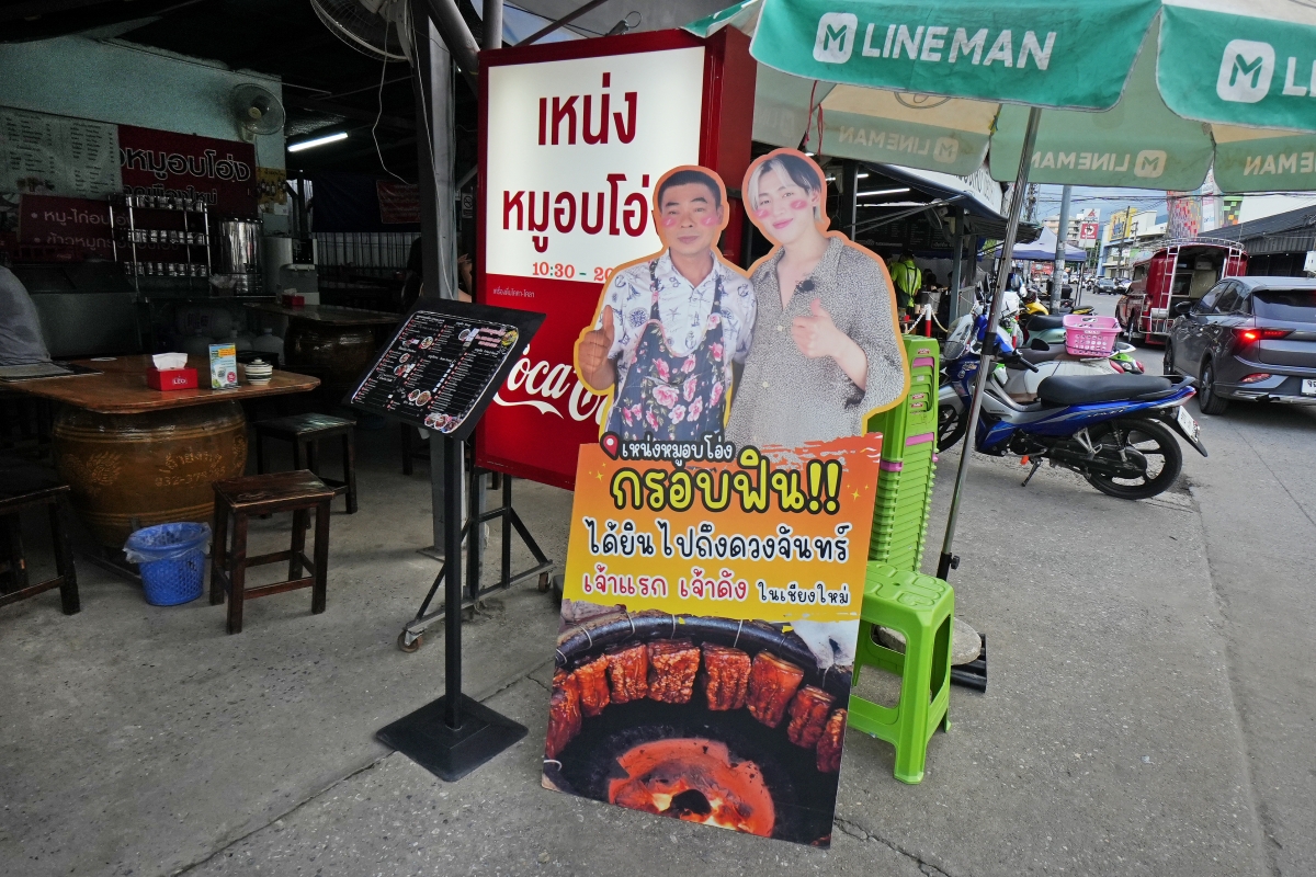 喜歡吃脆皮烤豬肉的朋友看過來~今天要分享給你們的這間「Neng’s Clay Oven Roasted Pork(Neng Moo Ob Ong/เหน่งหมูอบโอ่ง ตลาดเมืองใหม่)」是許多清邁在地人與觀光客都公認的必吃名店,熱門用餐時段常常一位難求(不喜歡排隊的話可以挑比如說下五兩點到五點這種時間來),主打的脆皮豬肉或者說脆皮燒肉是放在傳統的陶甕用慢火炭烤而成,香氣逼人,而且吃起來皮酥肉嫩,品嚐時也不會覺得太油膩,然後它的地點緊鄰著在地的市場,環境雖然不是走什麼氣派、有質感的路線,但相對價格也非常親民,而且除了脆皮豬肉以外還點得到八十種以上的其他泰式料理,如果大家是住在清邁古城區那一帶的話很推薦來吃一波唷!