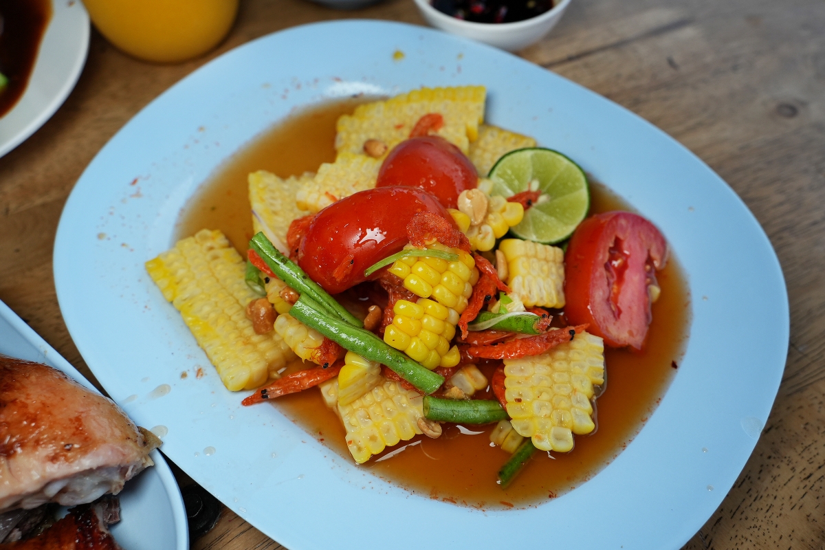 總之跟涼拌青木瓜比起來,其實我更愛這種涼拌的玉米,吃起來味道酸香開胃(我選不加辣,不然阿峯不敢吃),然後還有加入蝦米、花生、番茄、生的豆子等等,跟脆皮豬肉和烤雞交互著吃有解膩之功效。