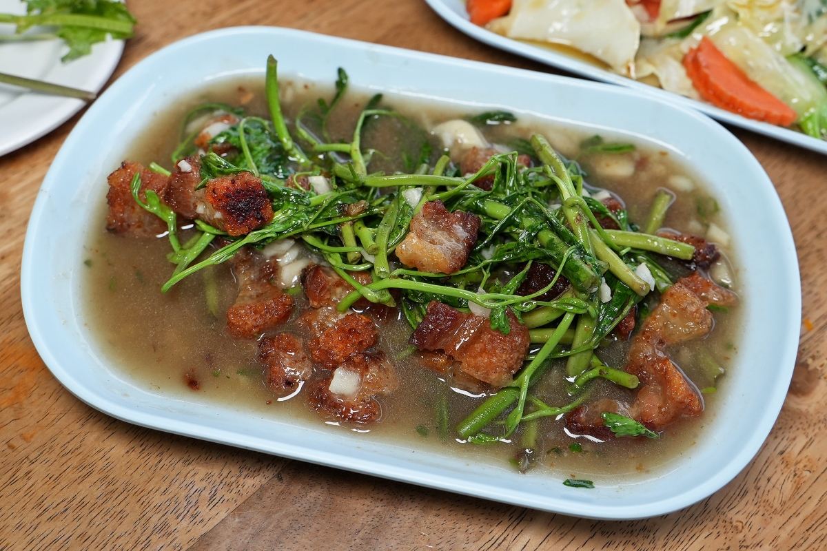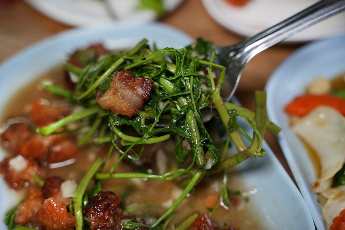 這含羞草其實炒起來的口感跟空心菜相當類似,蠻清脆的、菜葉也有嫩度,然後那脆皮豬肉因為一直泡在炒菜的湯湯水水裡所以吃起來口感偏軟,如果你們想吃到真的有脆度的脆皮豬肉的話還是建議要單點。