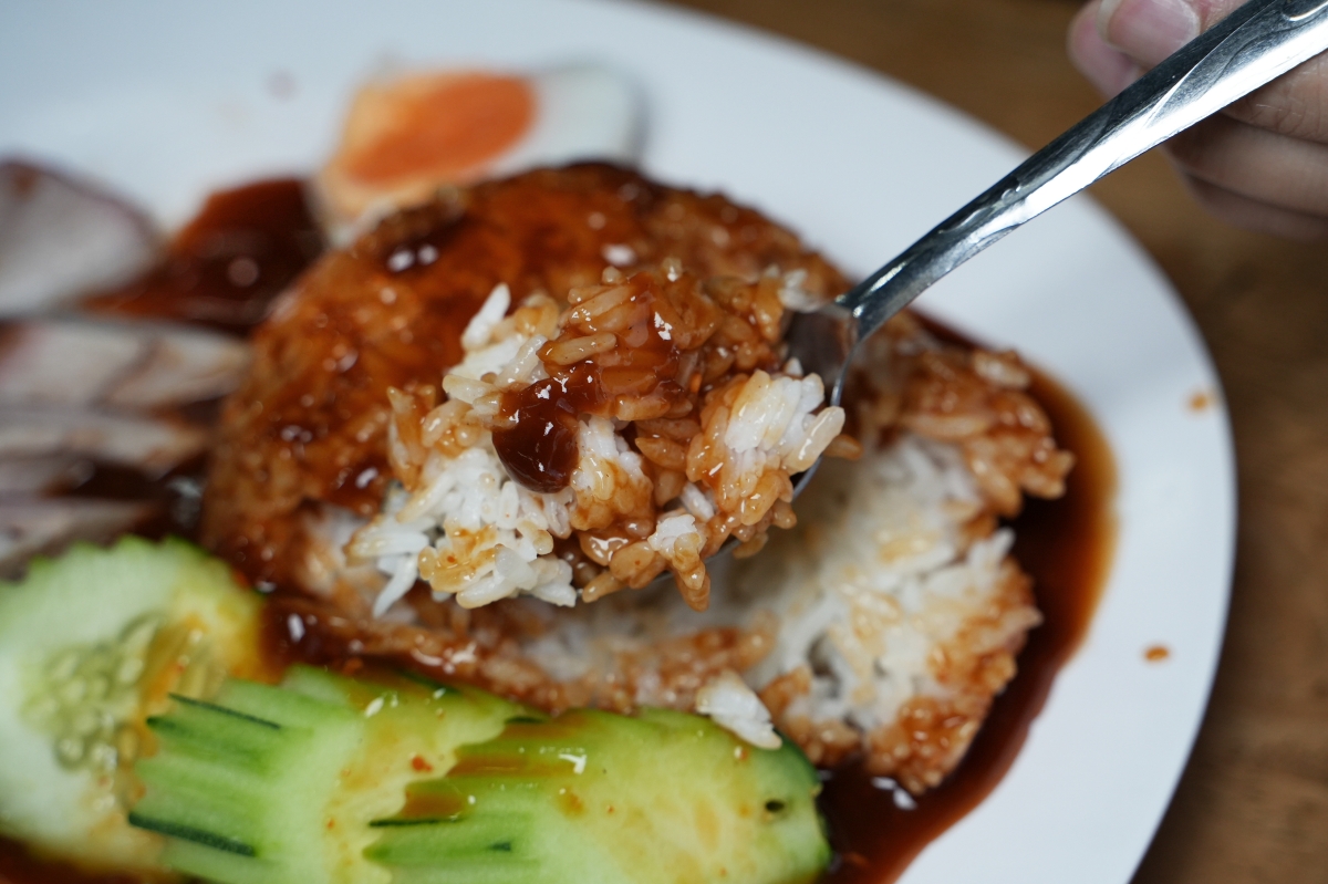 這一盤看起來很不簡單的東西…英文菜名就只是「Pork Neck with Rice」而已,並沒有特別解釋上面淋上超多的是什麼醬…