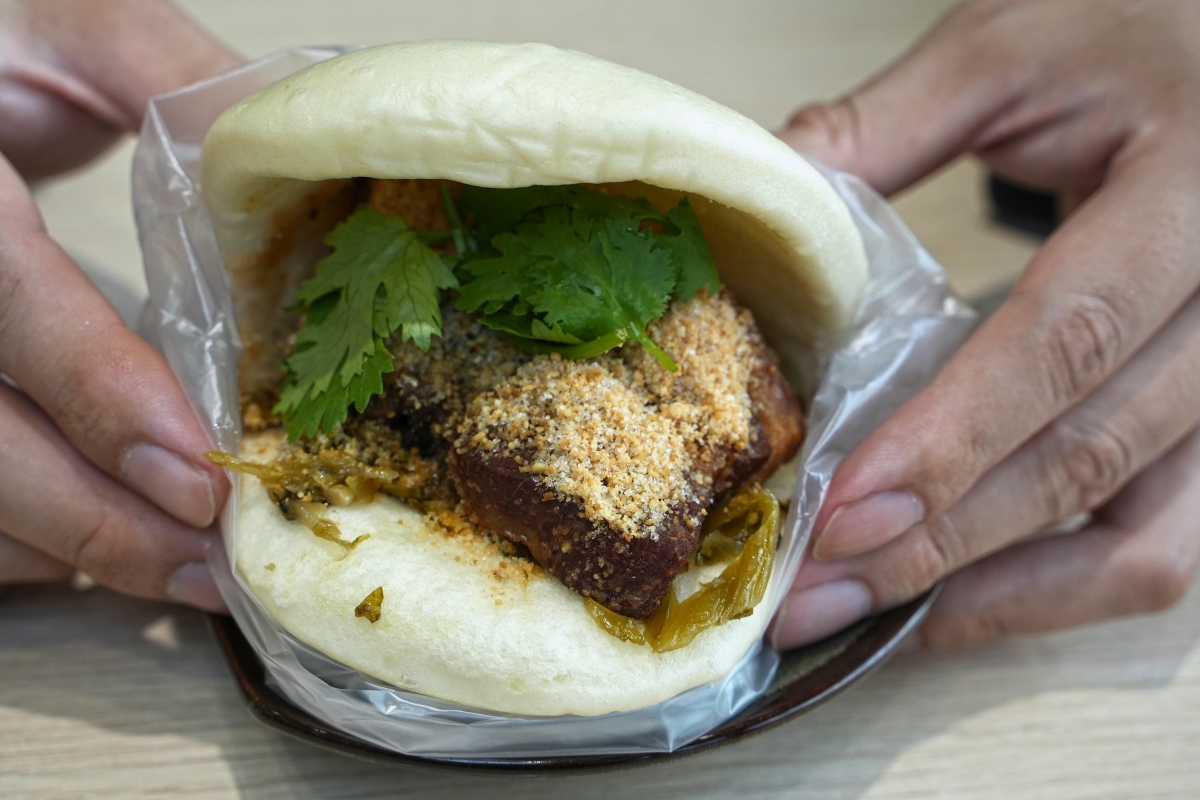 再來看到的是豬一十五招牌品項之一的「刈包」,雖然名字就是普普通通的刈包…但一拿起來就可以感受到它外皮蒸得鬆軟又不失彈性,然後還沒拿起來就可以聞到迷人的花生粉香氣,裡頭那塊爌肉看起來也是相當厚實。