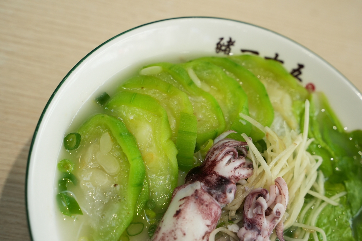 湯頭喝起來是鮮甜的(聽說主要是有用豬腿骨、整隻雞骨和五種蔬菜去用心熬煮六個小時而成),有融入小卷的鮮味和絲瓜自然的甜味,另外還有薑絲的一些辛味,我覺得大熱天來上這一碗是蠻清爽的,然後適合配著那些比較重口味的小菜一起品嚐。