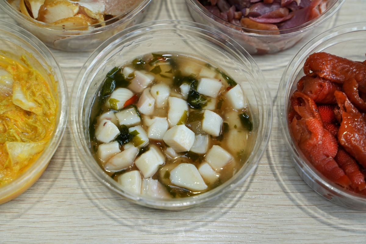 我們那天還拿了一個在一般小吃店比較少吃到的「芥末魷魚」,切成丁狀的魷魚軟Q彈牙,入口後的芥末嗆味還蠻明顯的,但我跟朋友都非常喜歡!(我平常就蠻愛吃那種哇沙比口味的豌豆零食的)