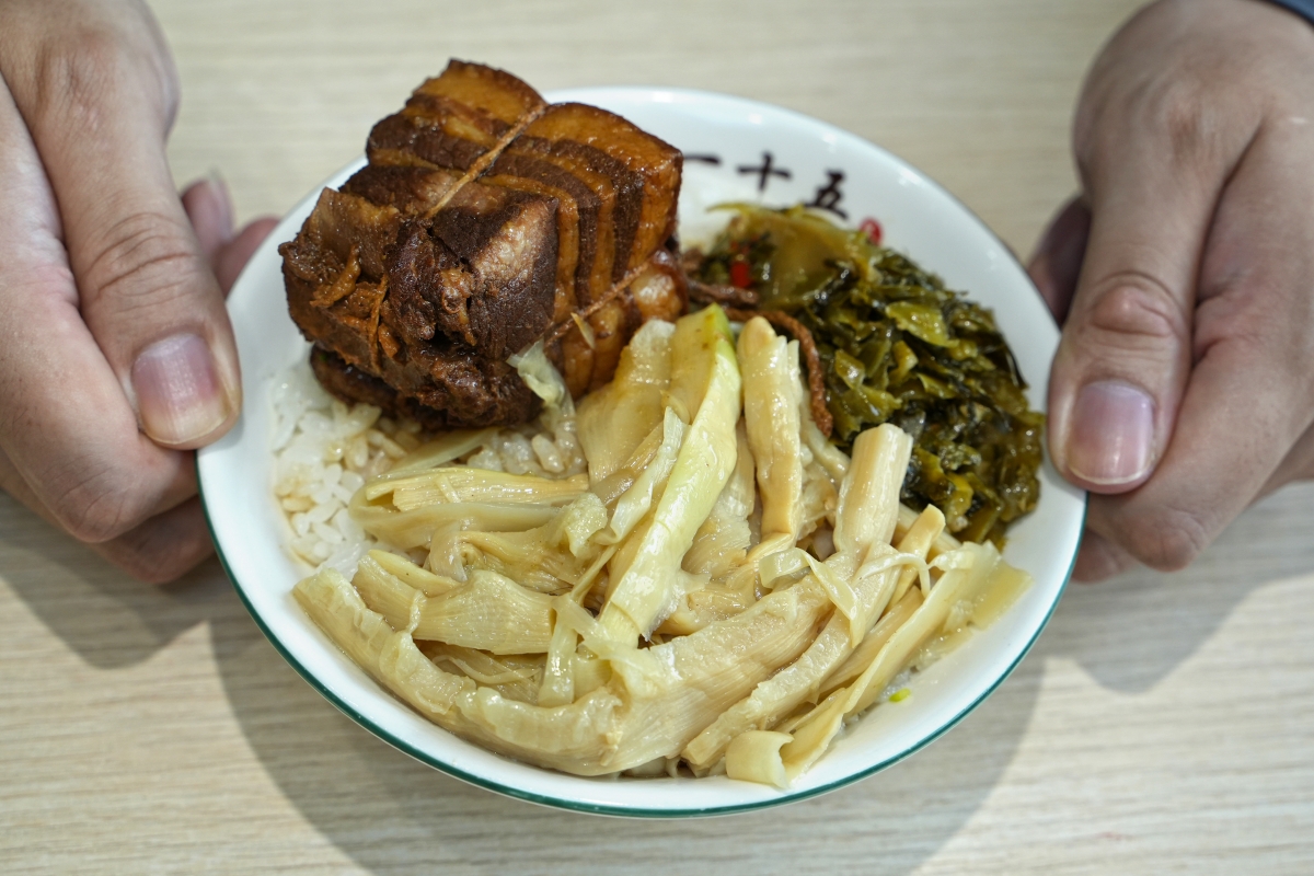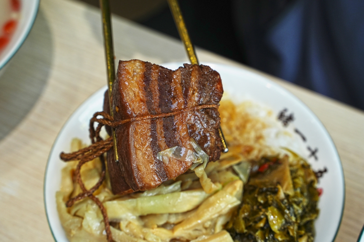 最後分享的是「東坡爌肉飯」,這道一上桌我就看得直流口水…他們的爌肉真的像一些大餐廳賣的東坡肉一樣有用繩子綁著,賣相非常吸引人,而且那個滷汁的香氣也好銷魂。