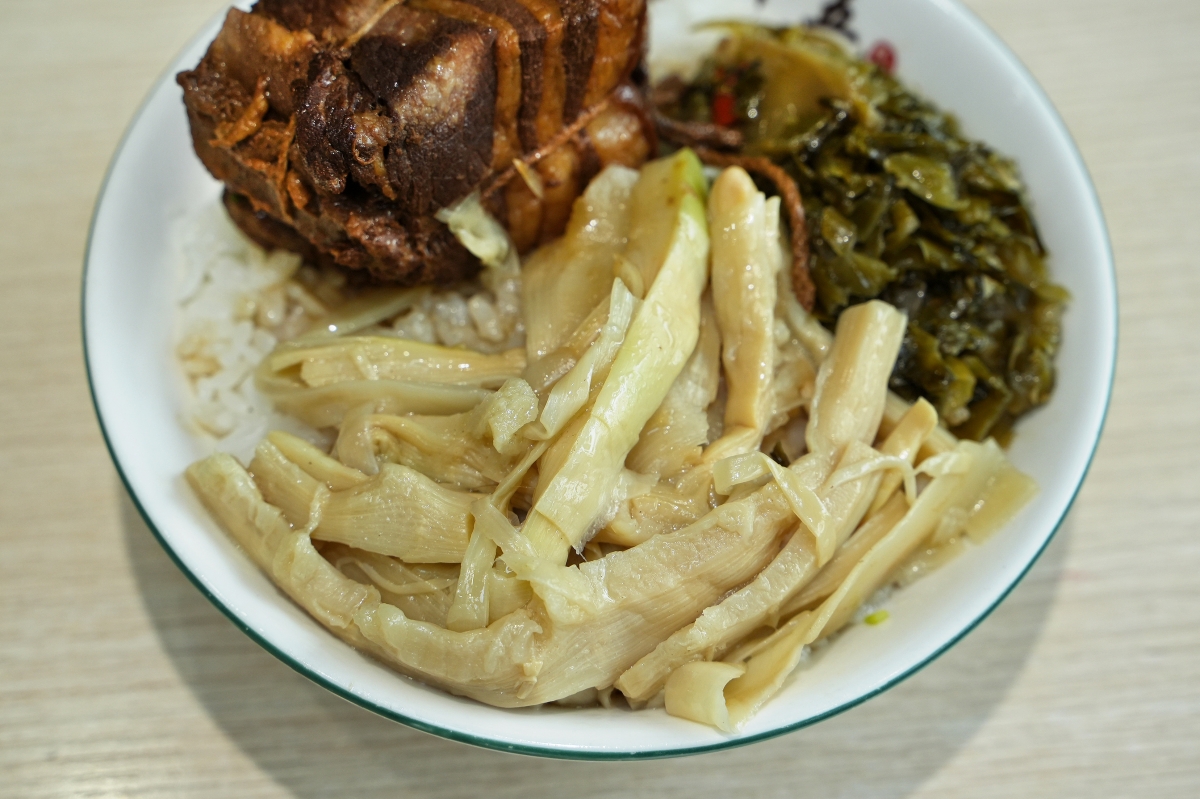 這裡的爌肉飯附上了大量的筍絲和酸菜,筍絲的部份除了又嫩又脆以外還帶點酸度,跟酸菜一樣都起了很好的解膩效果,另外白飯上也有淋上些許滷汁,讓人扒起飯有種停不下來的衝動~