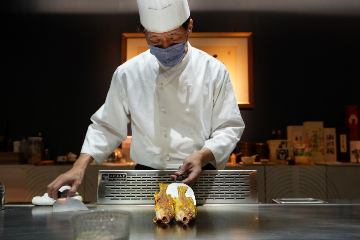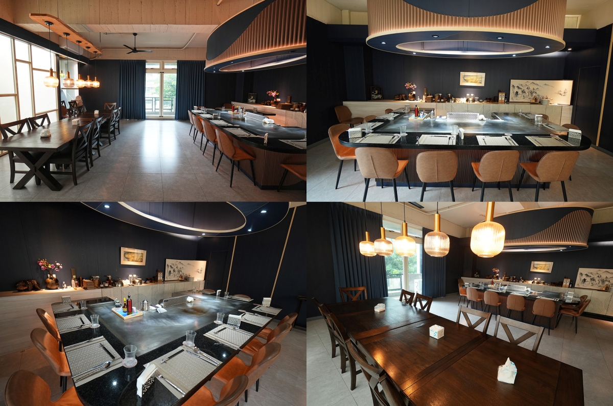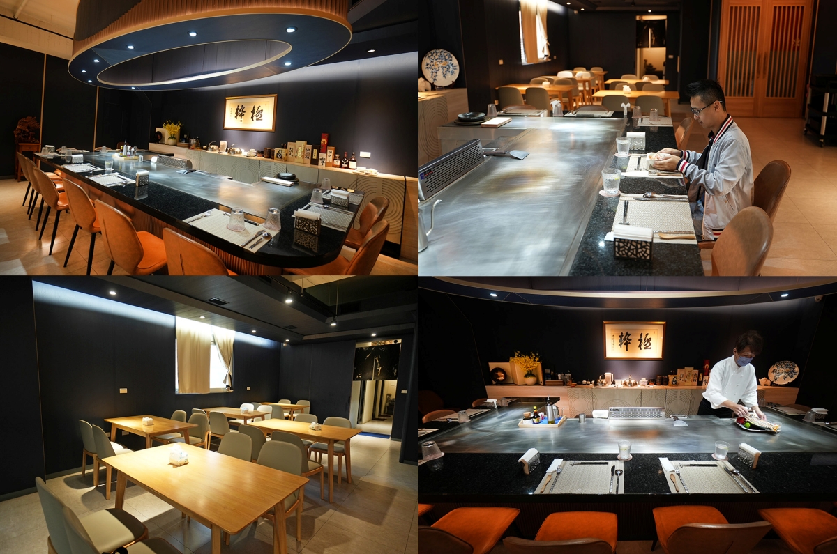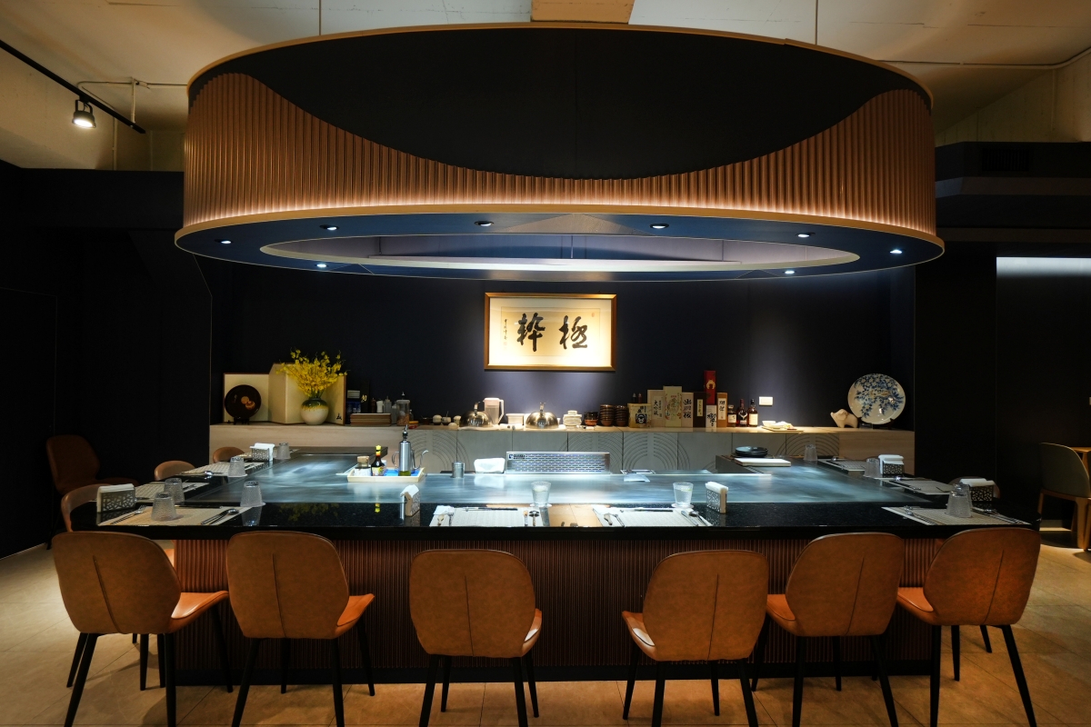 「粋 割烹鐵板燒」的用餐環境基本上就是在照片中的鐵板燒煎台前(如果坐滿的話,右邊還有一些一般的座位,或者用完正餐以後想到旁邊的座位享用甜點也沒有問題),然後我覺得這裡的鐵板燒煎台設計得很有高貴典雅又不失沉穩的風格,用餐氣氛完全不會輸給一些其他走中高價位的鐵板料理餐廳。
