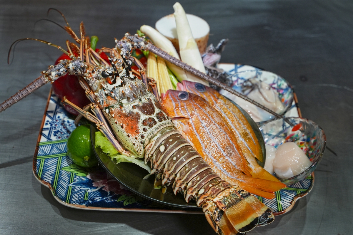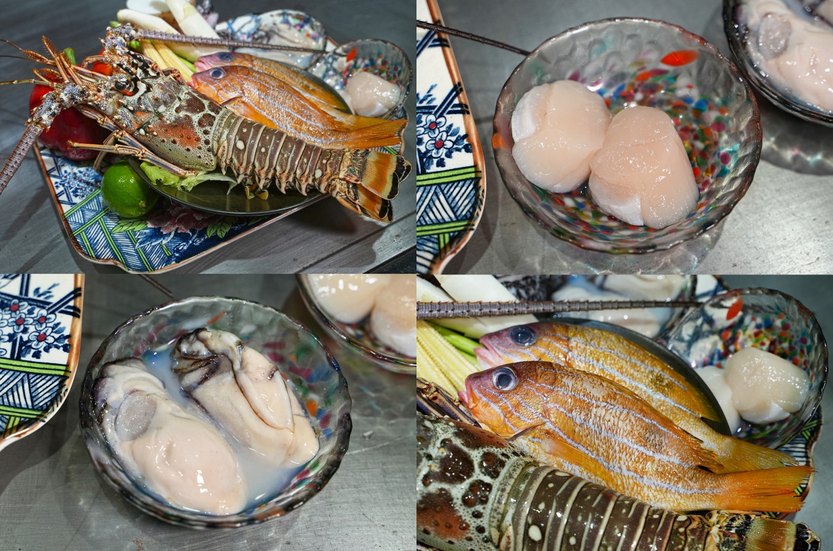 基本上來享用他們的無菜單料理都會先展示一下當天料理用到的食材讓客人看一下(內容會依序四季變化而有所調整,並不是固定的),像我們當天主要可以期待的食材就是巴西龍蝦、生食級干貝、超大顆牡蠣以及整尾的赤筆仔,後面還會有菲力牛排喔!