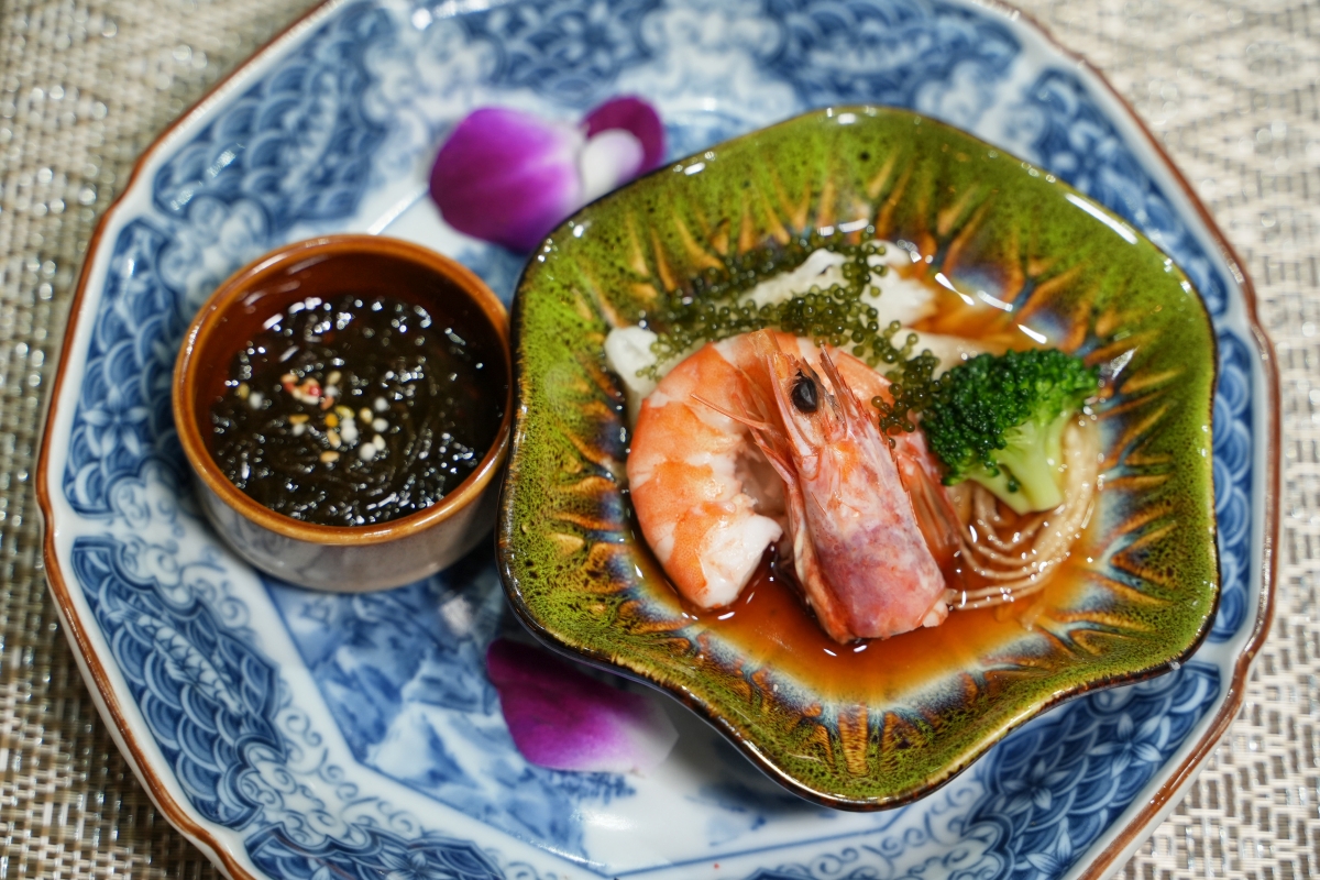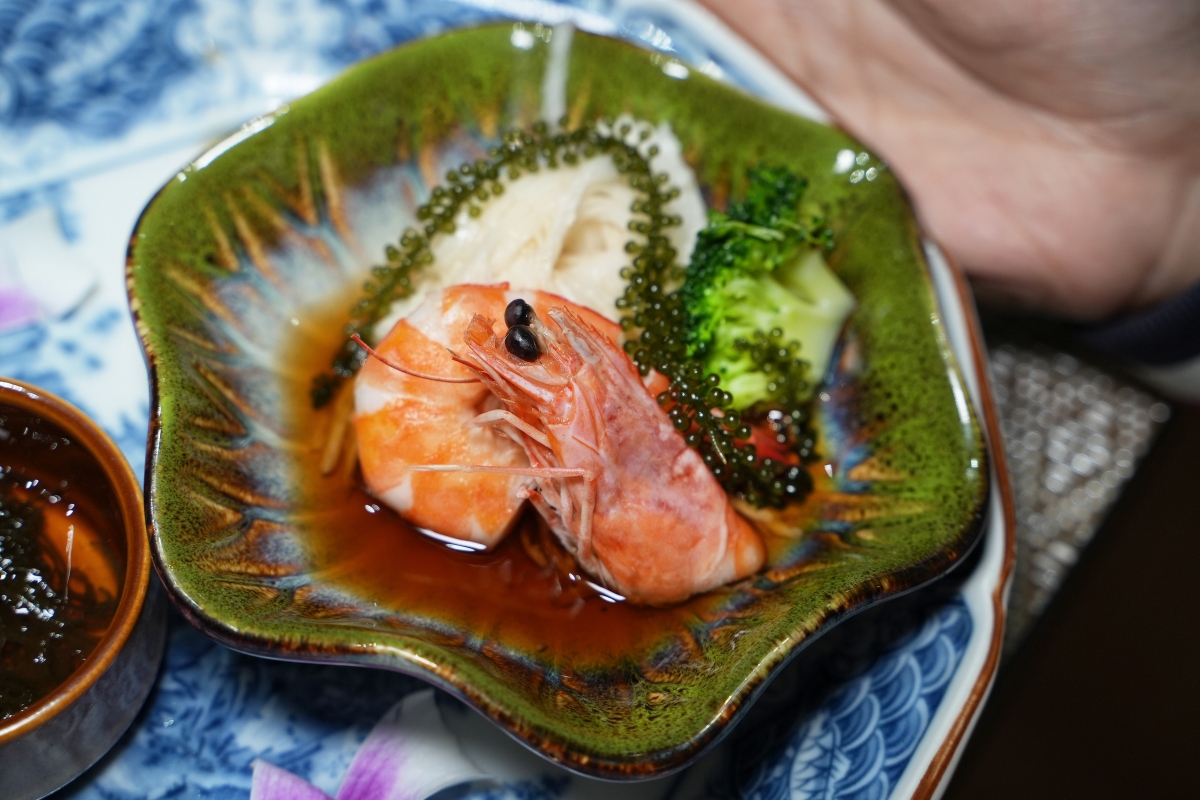 首先上桌的是屬於冷盤類的開胃前菜,左邊那一碟是「水雲醋」,右邊是燙熟的白蝦拿去涼拌,搭配海葡萄、花椰菜以及切成絲狀的山藥。