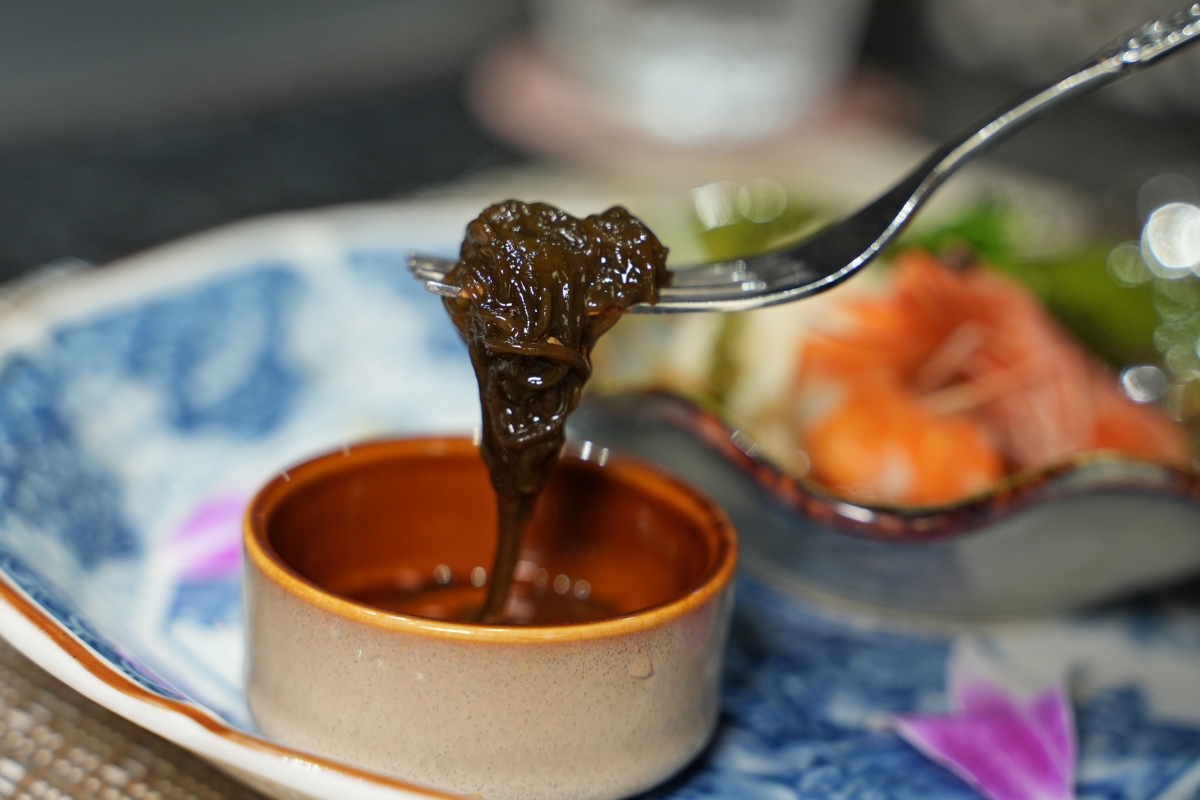 再來看到的是俗稱「水雲」的「岡村枝管藻」,它其實跟剛才切絲的山藥有點異曲同工之妙…都有著黏黏滑滑的口感,不過搭配酸香的醋一起入口十分清爽,讓人有胃口大開的感覺!