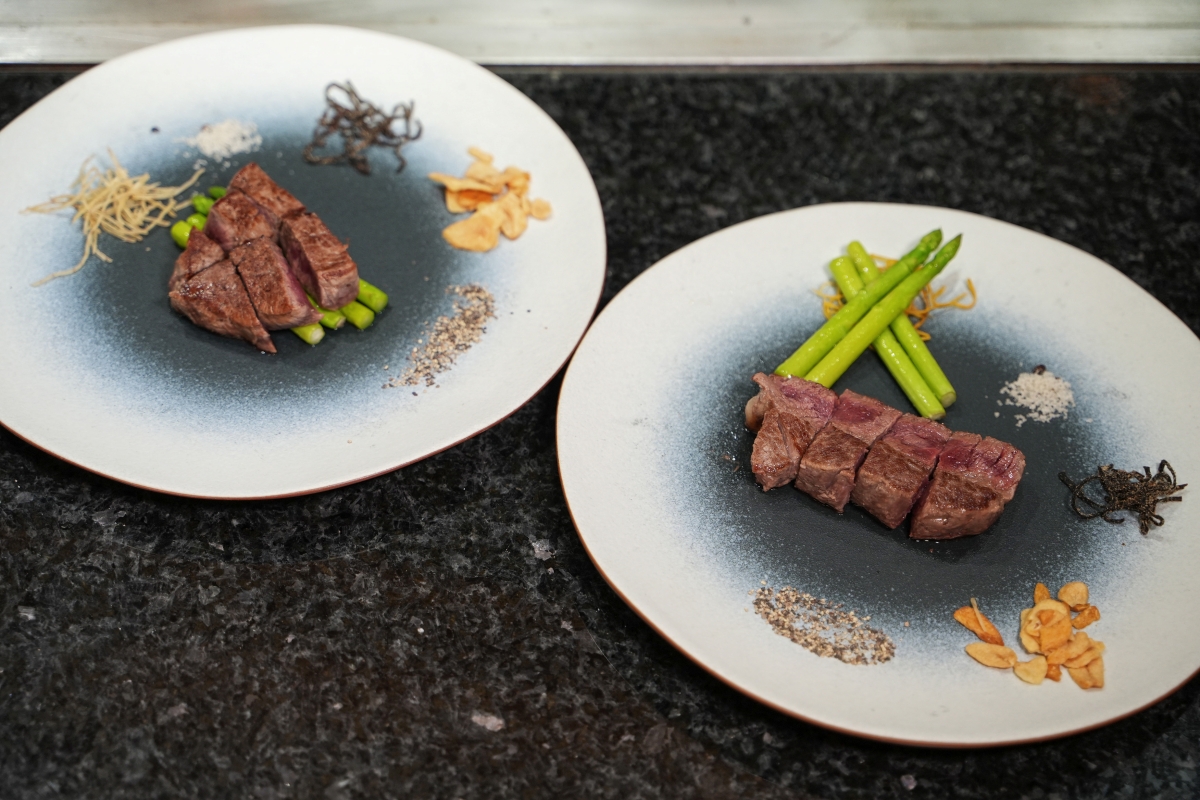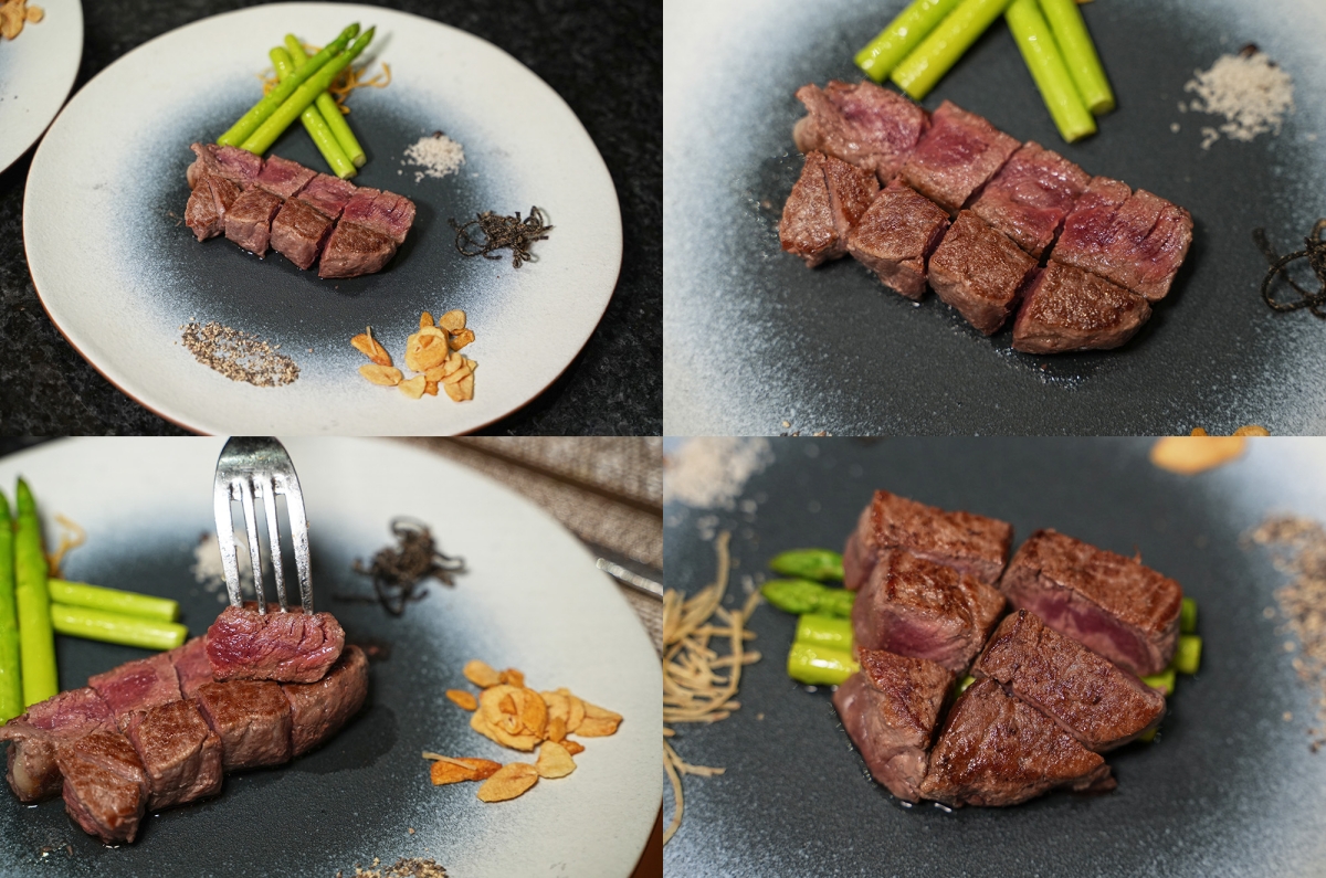 比較不含油花的這個部位吃起來的特色就是特別鮮嫩,五分熟的熟度咬下去可以感受到細緻柔嫩又多汁的口感,因為風味比較柔和,所以師傅特別準備了特調的黑胡椒、炸蒜酥、昆布鹽、松露鹽和芋頭絲讓客人可以搭配著一起品嚐,交織出不同的美好食感!