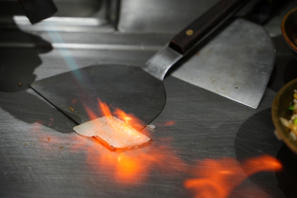 當天提供的是先在鐵板上香煎後再灑上起司進行焗烤的版本,師傅在焗烤的同時,我跟阿峰看得口水都快滴下來了…