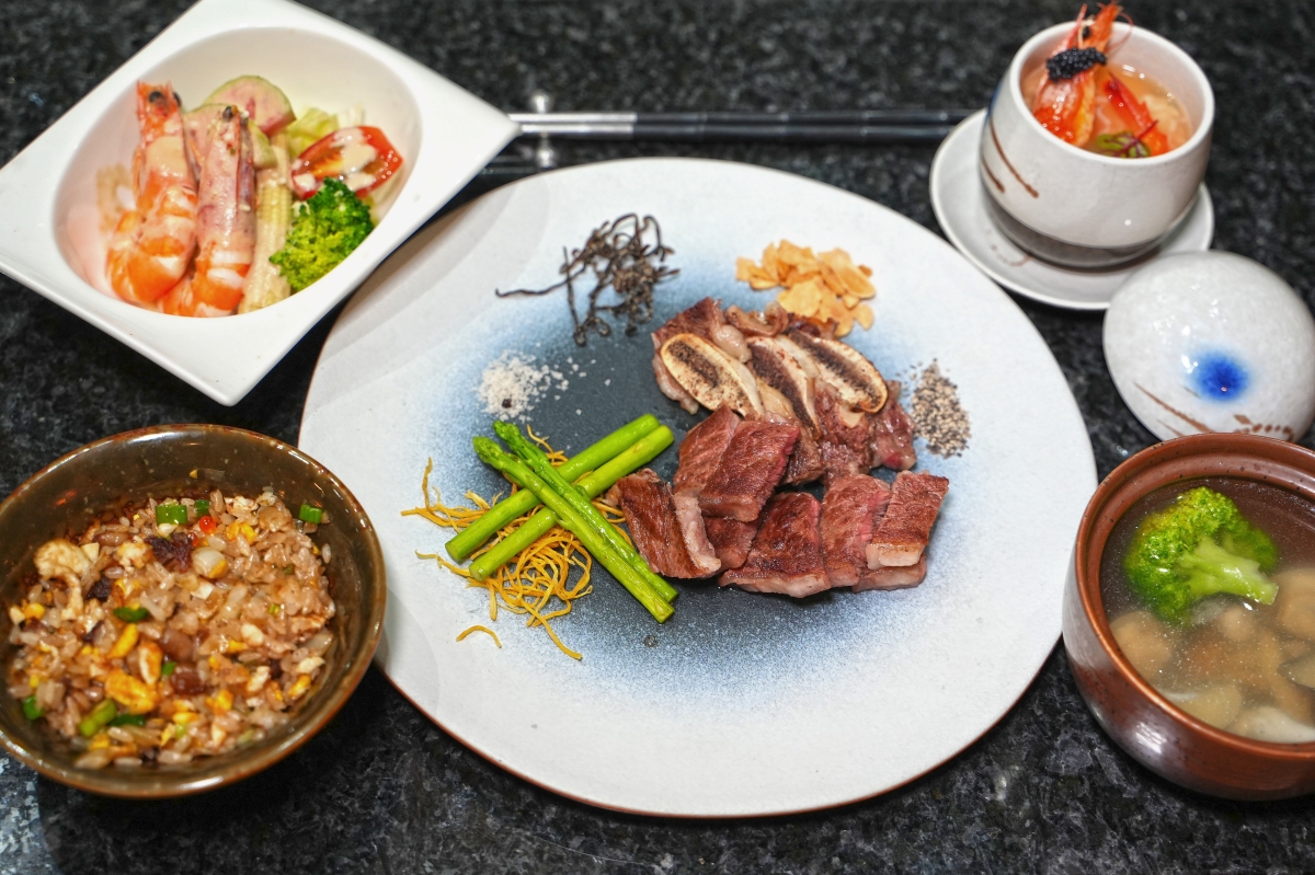 再來跟你們簡單分享一下最近才開始推出的「平日限定特餐」,目前總共有「雞腿排(399元)」、「櫻桃鴨胸(499元)」、「伊比利豬(450元)」、「牛小排(450元)」這幾種選擇,如照片中所示,都會附上沙拉、湯品、炒飯、蒸蛋,其實一個人這樣吃下來也是有豐盛又飽足的感覺,而且食材品質絕對比一般平價的鐵板燒好很多。