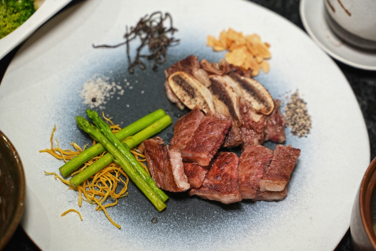 像照片中這份就是師傅現煎的牛小排,跟我們剛才的菲力牛排一樣可以搭配黑胡椒、炸蒜酥、昆布鹽、松露鹽和芋頭絲一起品嚐,而且還吃得到平價鐵板燒不會出現的蘆筍。