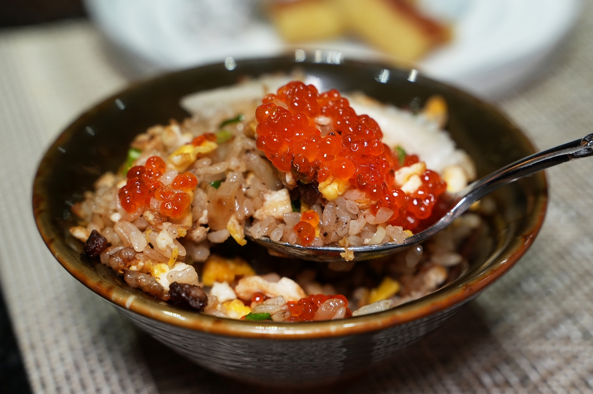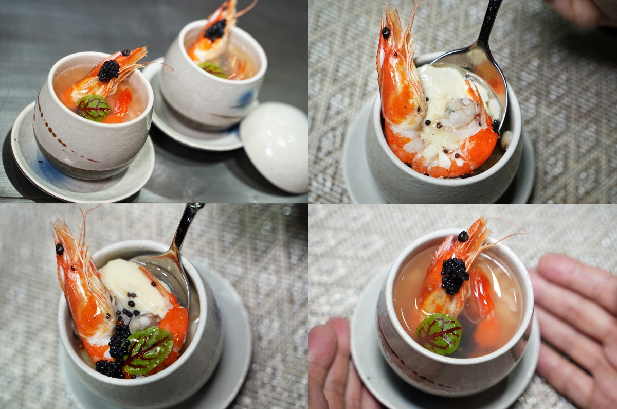 下一道要說是蒸蛋還是茶碗蒸應該都可以…總之它非常真材實料,除了可以吃到整尾大蝦和蛋的滑嫩感以外(裡面還有蟹肉、鮭魚卵跟蛤蠣,用料豐富),上面還吃得到奢華的魚子醬,鮮味與鹹味讓這碗原本走甘醇路線的蒸蛋有風味更上一層樓的感覺。
