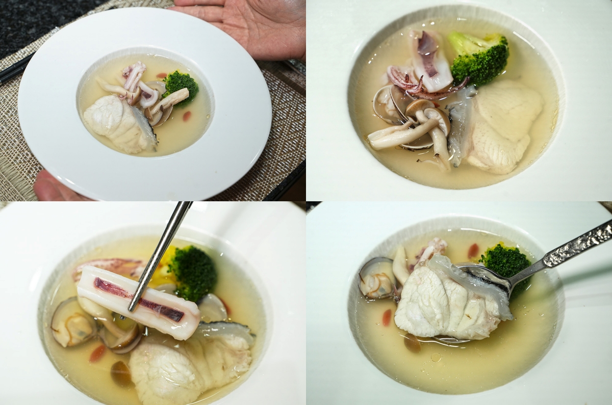 我們這次的無菜單料理湯品提供的是可以吃到龍膽石斑、透抽、蛤蠣跟蕈菇、花椰菜的海鮮湯,龍膽石斑肉質緊實、有彈性而且魚皮還富含膠質,透抽吃起來Q彈有勁,最近轉涼的天氣來上這樣一碗鮮美又暖胃的湯品非常舒服!