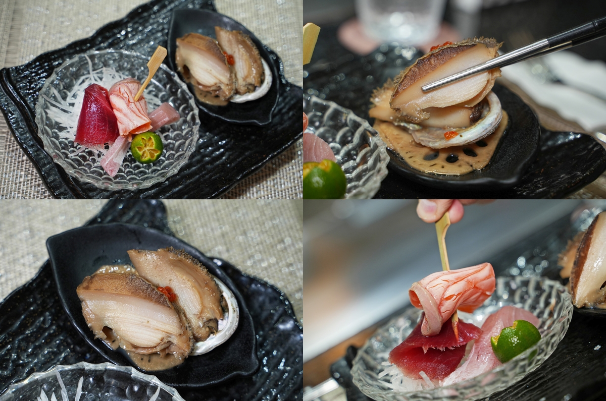 再來看到的是「生魚片」和「鮑魚」,生魚片的海鱺吃起來比較清甜Q脆,鮭魚跟鮪魚肉味跟油脂味都比較濃郁一些,我個人很愛,然後鮑魚的肉質非常厚實(上面還有一些鮭魚卵),搭配的是有點像五味醬的醬汁,咀嚼起來甘甜又鮮美,讓人不捨得太快吞下肚。