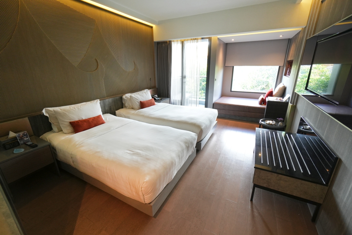 我們這次訂的是這裡最便宜的「Deluxe Room(豪華房)」,房間大小大約9.7坪左右,可以選擇偏好一大床或兩小床,我覺得兩個人住空間還算寬敞,也不會有兩個29吋行李箱無法同時打開的問題,然後整間房間的插座很充足,3C產品的重度使用者不用擔心會有充電處不夠的問題發生。