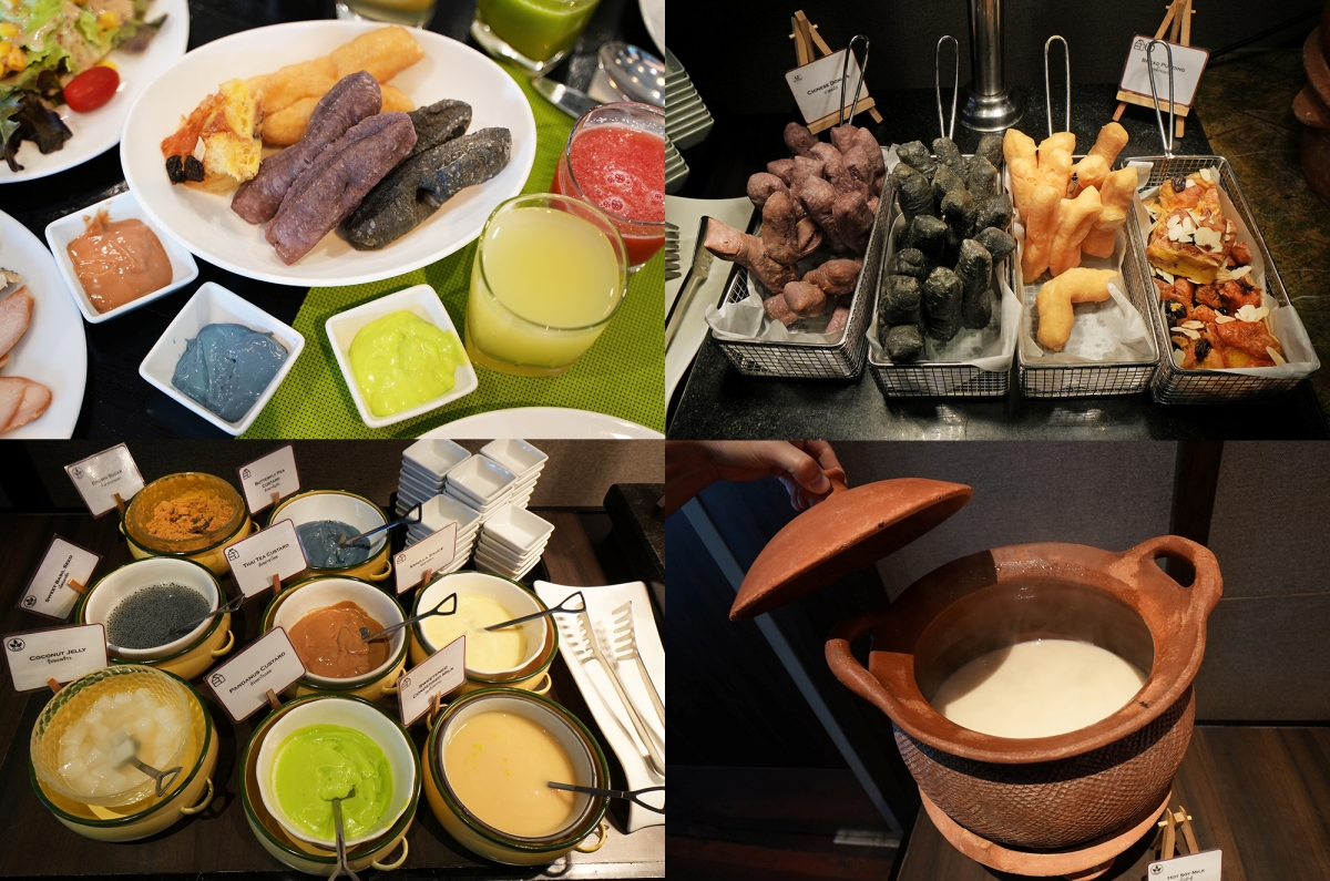 這一區有提供彩色的泰式炸油條,他們的油條跟台式的不一樣,吃起來比較沒那麼脆,但取而代之的是一種蓬鬆感,然後有八種醬料可以搭配一起享用。(右下角那一鍋是熱豆漿)