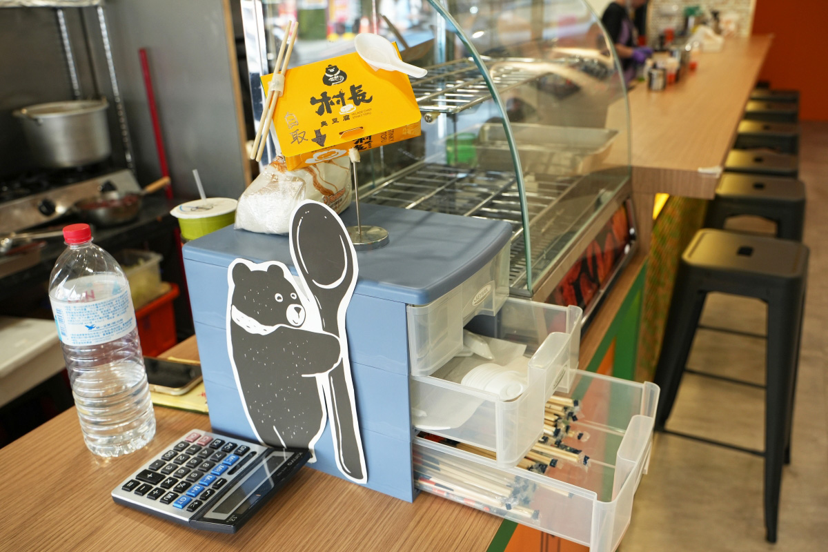 村長臭豆腐的吉祥物是一隻端著臭豆腐的黑熊,設計得蠻討喜的說~