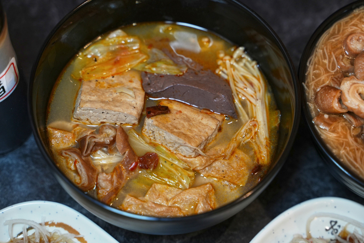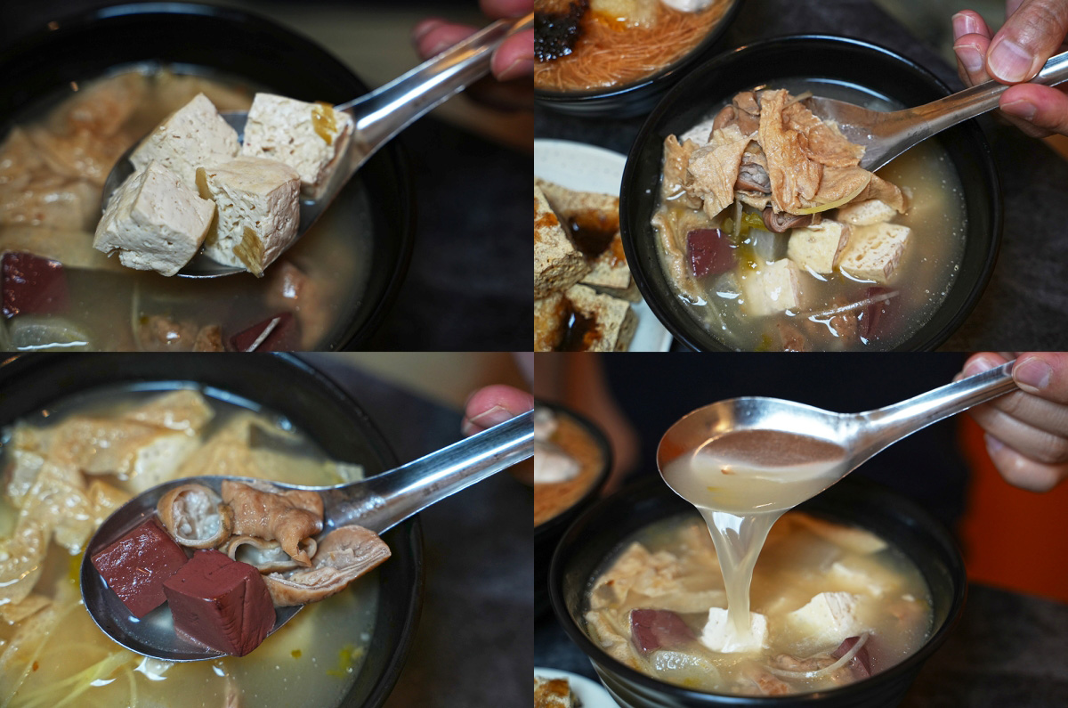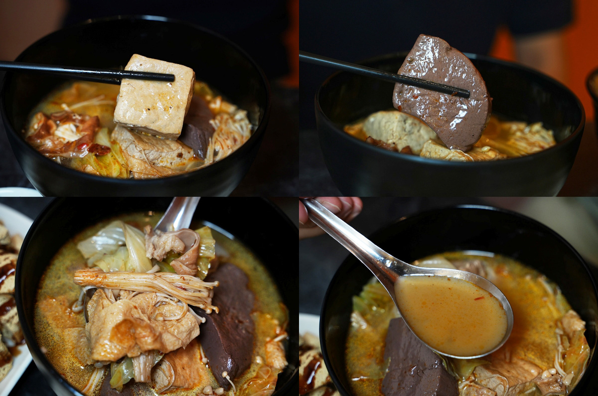 我覺得這碗麻辣鴨血臭豆腐的料比我想像中的還豐富,除了可以吃到煮得很入味的臭豆腐和鮮嫩的鴨血以外,隨便撈一下還可以吃到滷大腸、高麗菜、豆皮和數種菇類,而且那些食材的風味也有融入到湯裡面,所以不會讓人覺得整體的風味很單一。
