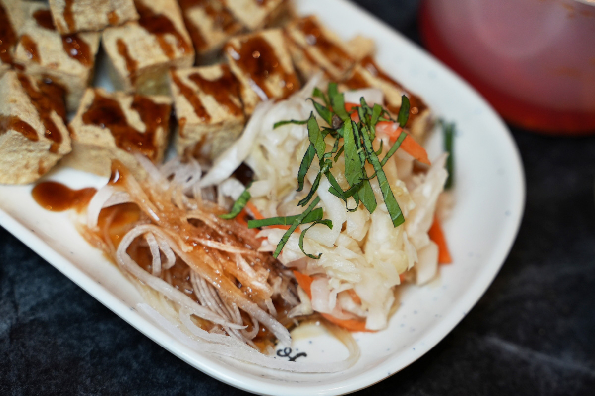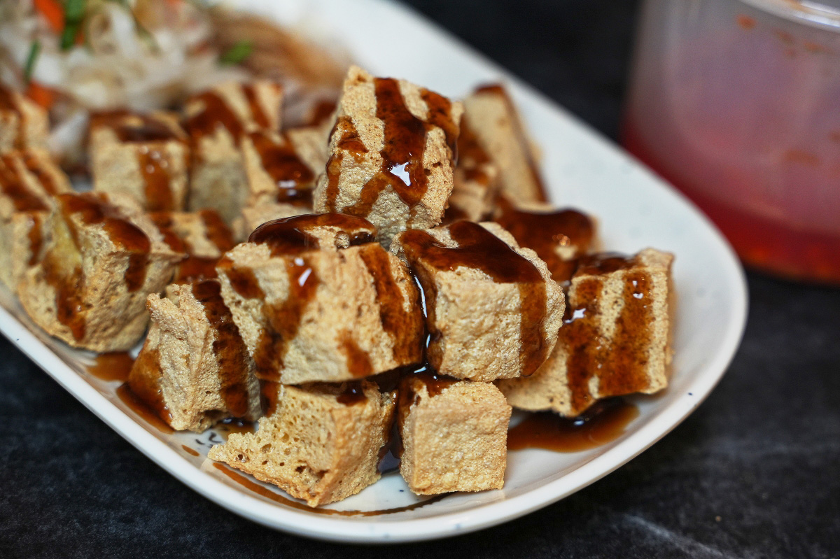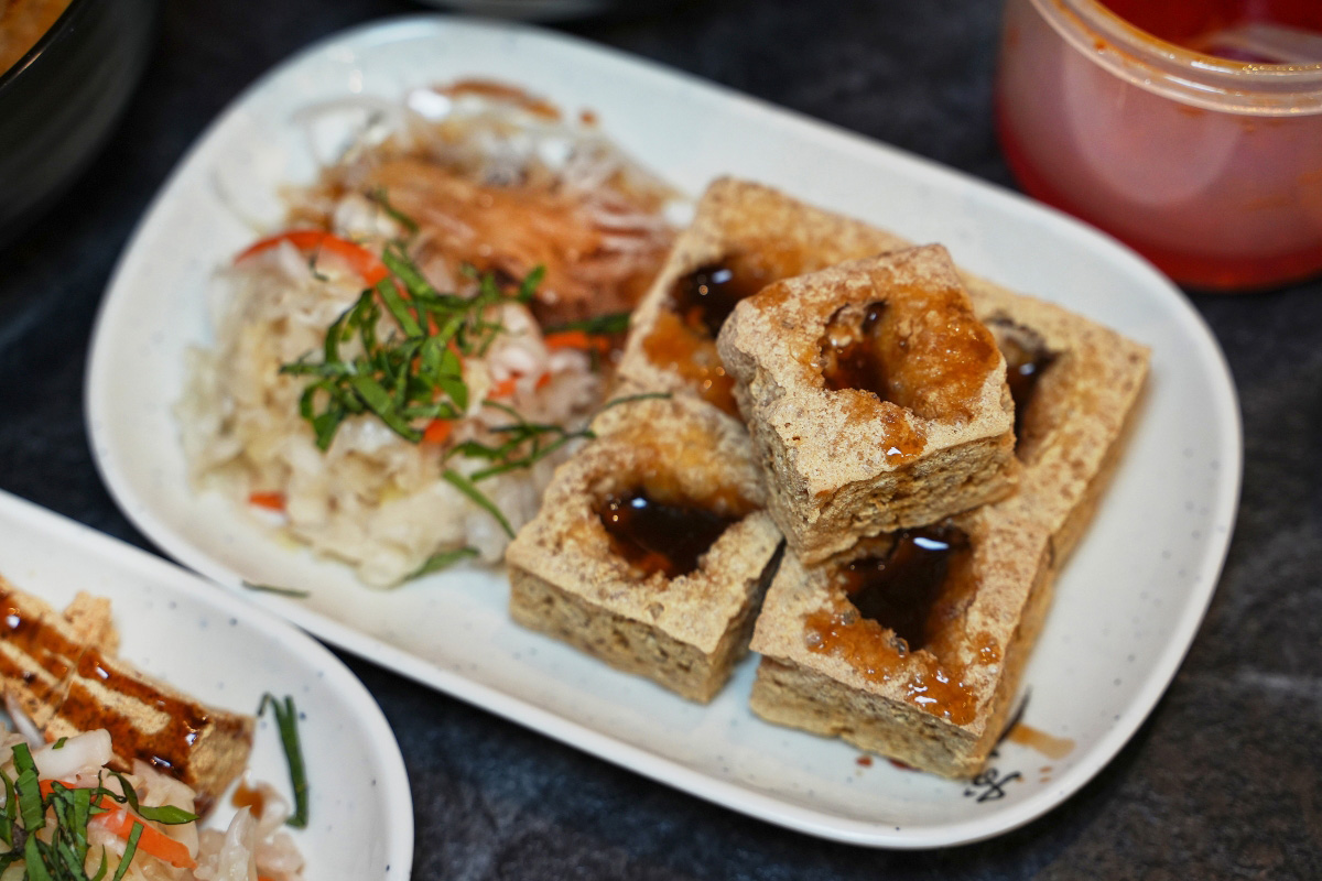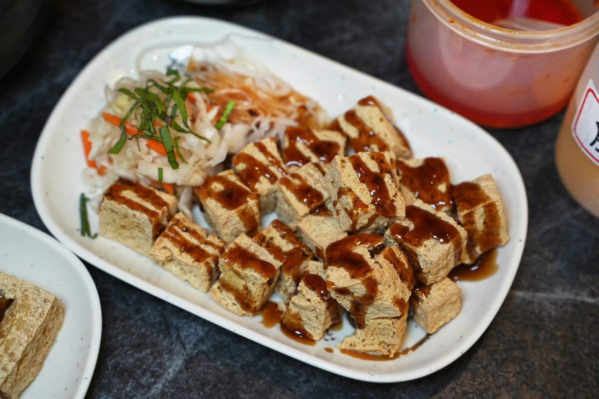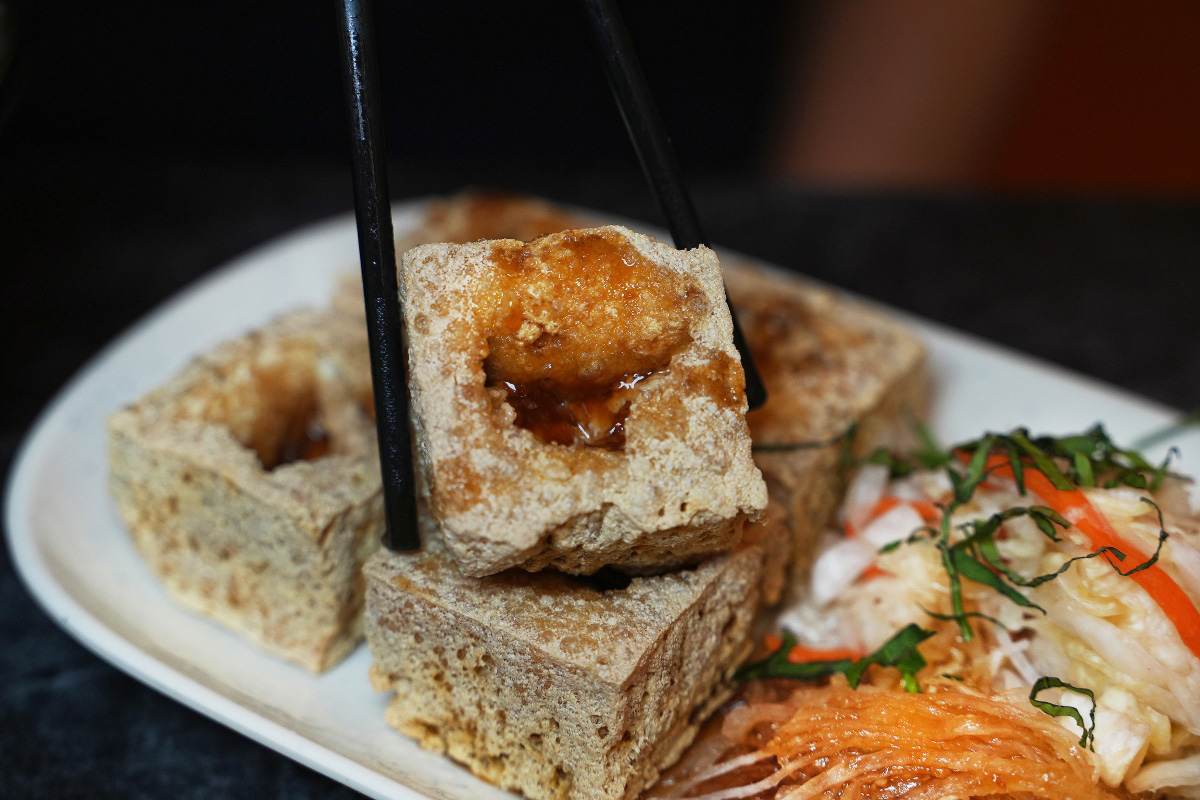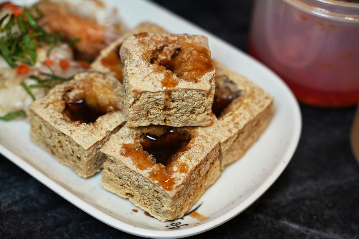 當天我們先從經典的「招牌臭豆腐」吃起,它就是四四方方、中間還有戳一個洞把醬料擠進去的那一種。