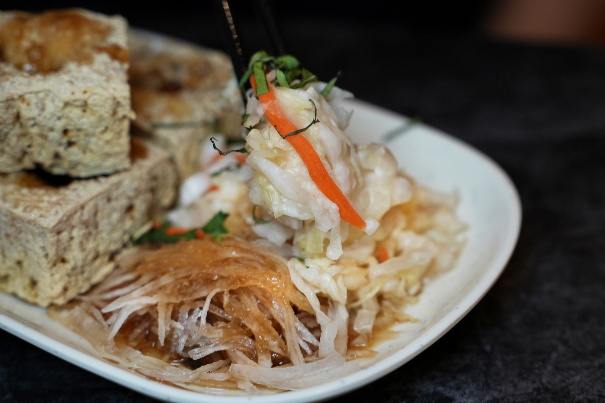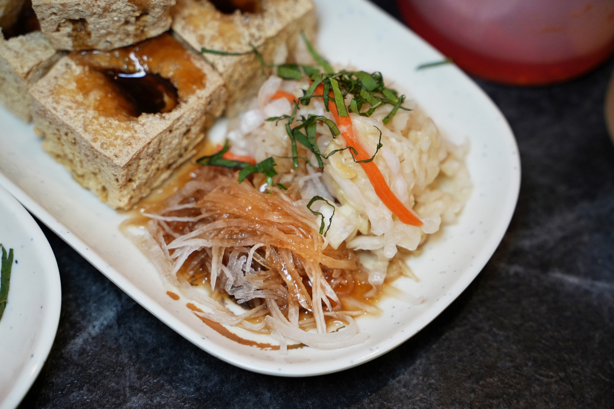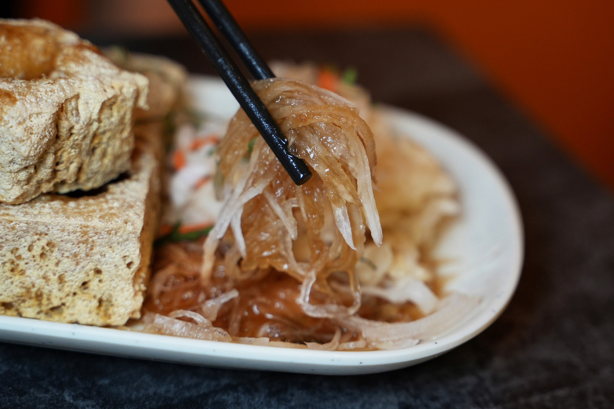 我比較少吃到臭豆腐有配白蘿蔔絲的,但這裡的白蘿蔔絲有一種清新的甜味,然後上面還淋上了一些像蒜蓉醬的調味料,跟炸過的臭豆腐一起吃有一種相輔相成的感覺。